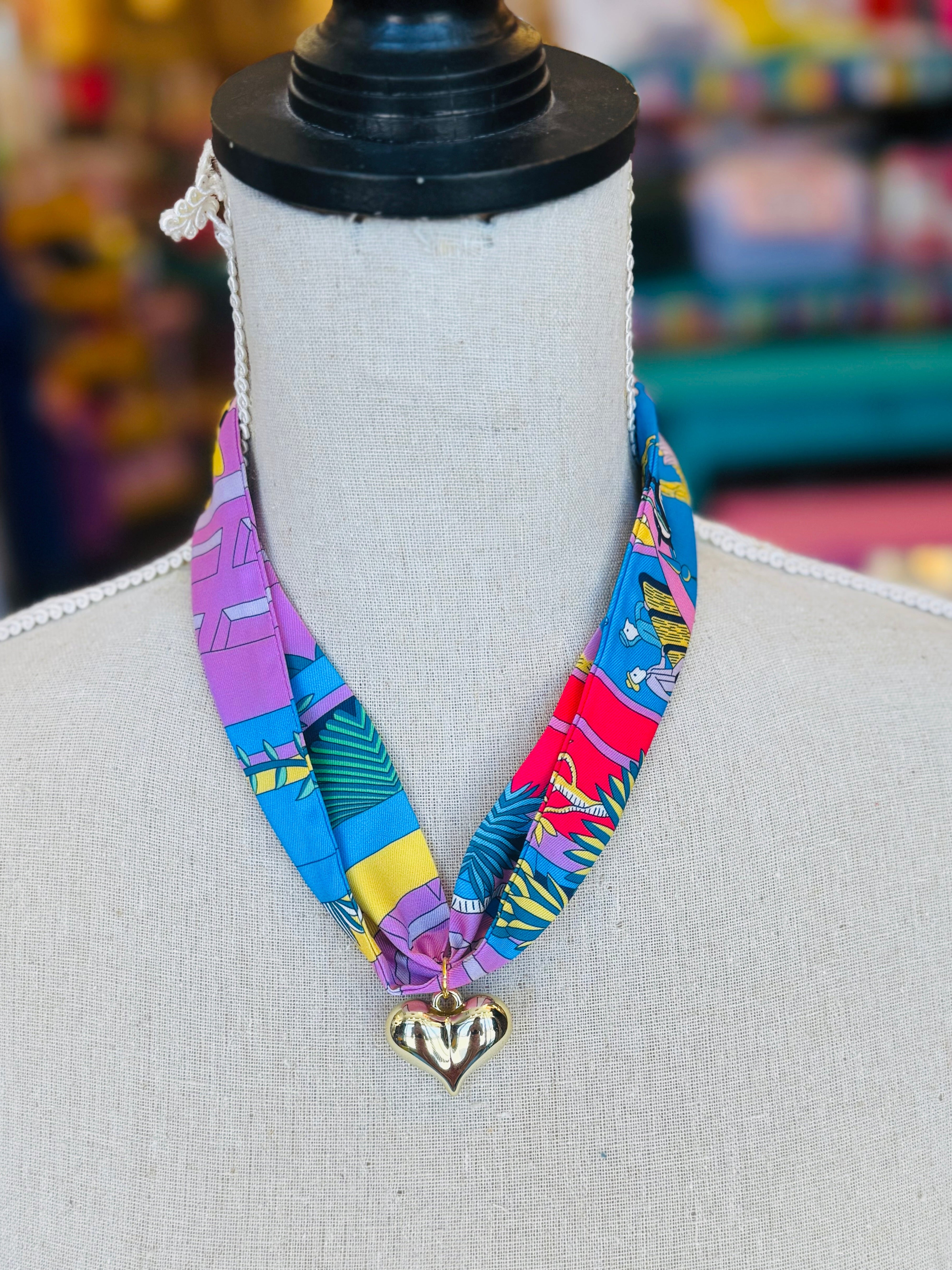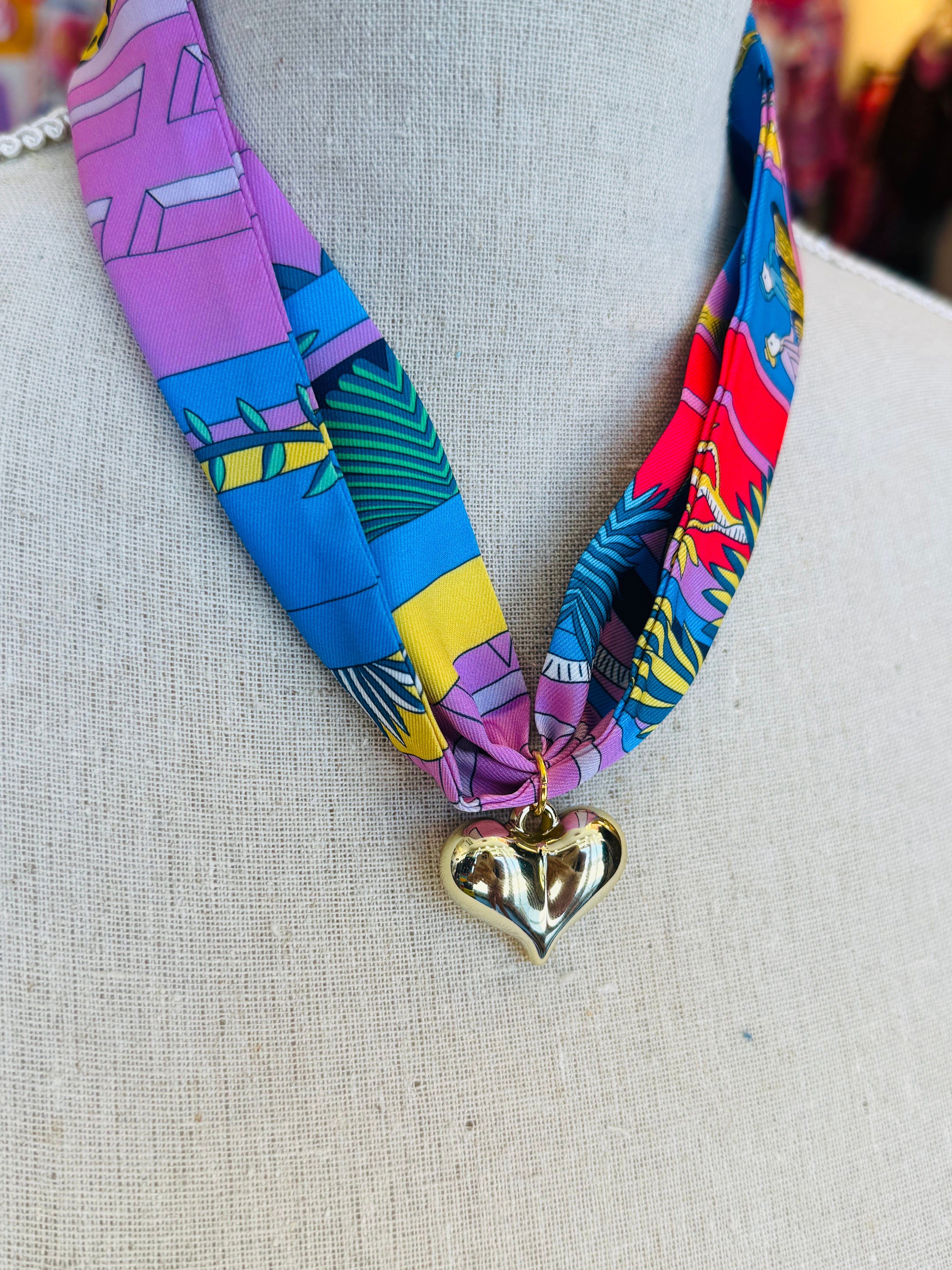Add a little love to your look with the Blue Print Scarf Heart Charm Necklace! This sweet accessory features a shiny gold heart charm that adds just the right amount of sparkle to any outfit. Paired with a soft, blue printed scarf-style chain, it combines comfort and charm in one effortlessly stylish piece.