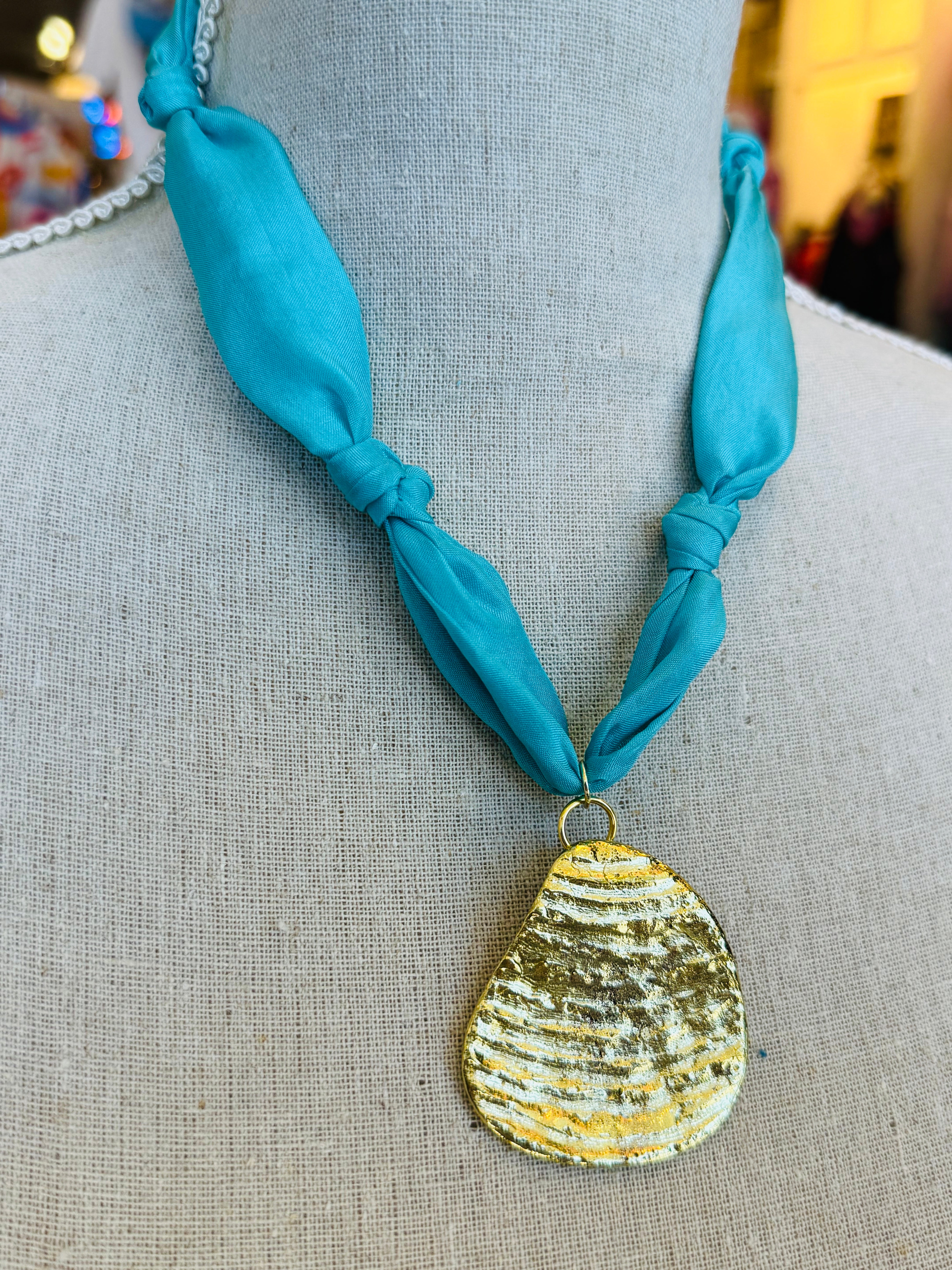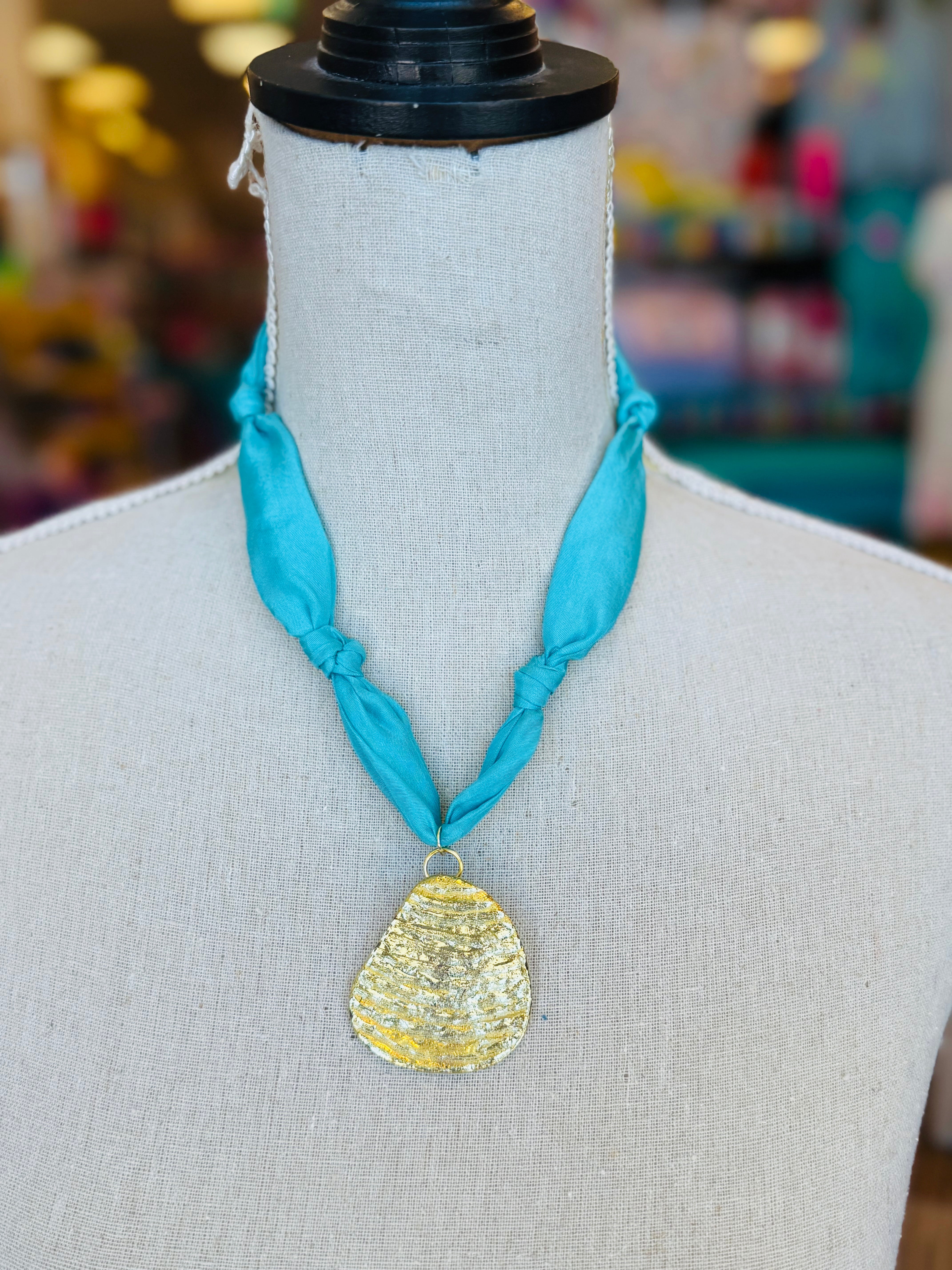 Close-up image of a blue scarf-style necklace with a textured gold medallion charm, styled to evoke breezy coastal vibes. The soft aqua blue fabric contrasts elegantly with the bold gold pendant, creating a light and stylish accessory perfect for casual or chic outfits.
