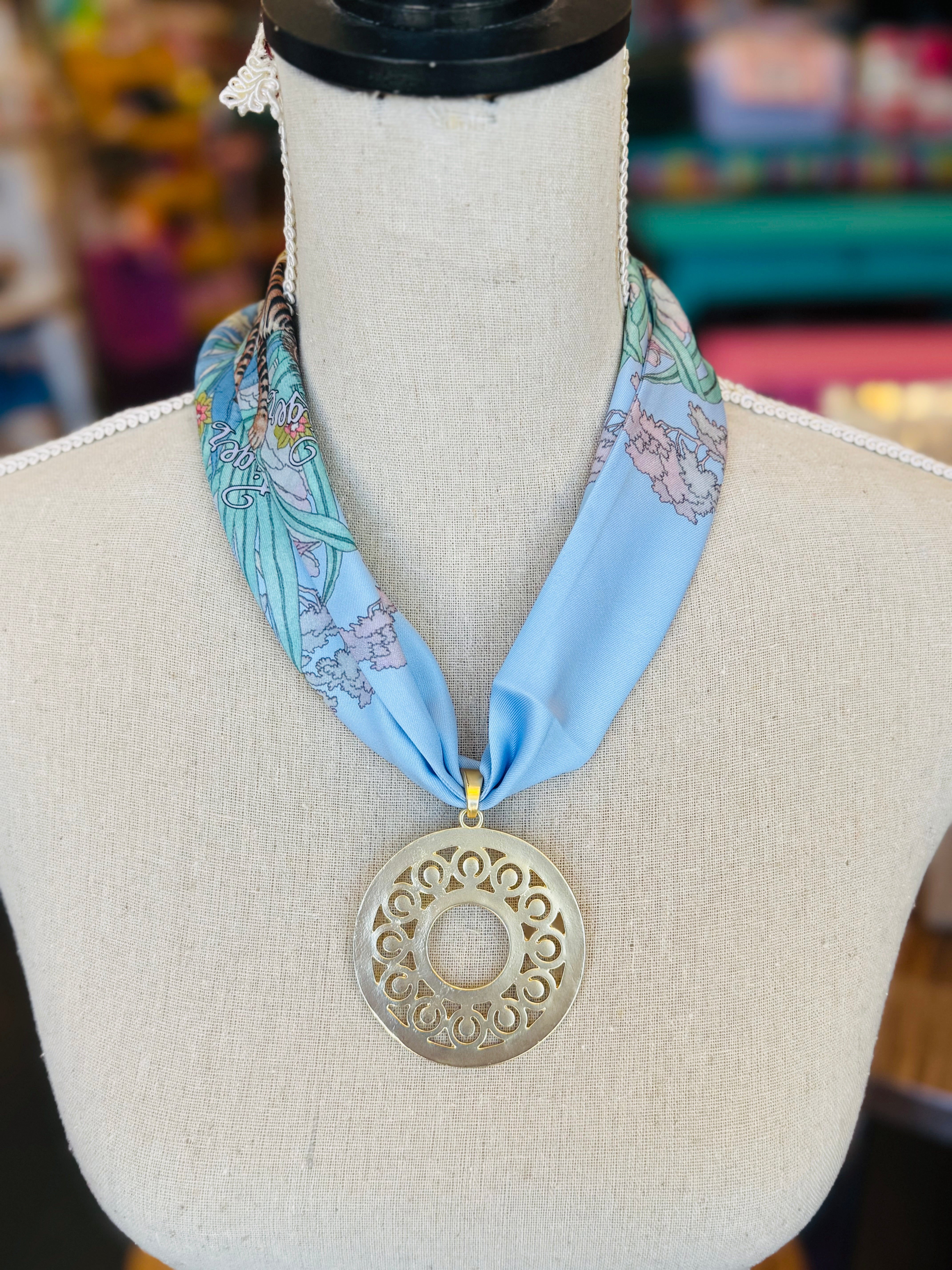Add a whimsical touch to your wardrobe with the Blue Scarf Golden Bloom Charm Necklace. This charming piece features a soft blue scarf-style band adorned with the phrase “lovely tiger” for a fun and flirty vibe. The lightweight design makes it comfortable for all-day wear, while the gold cutout medallion charm adds just the right amount of shine. Whether layered or worn solo, this necklace brings a playful mix of elegance and personality to any outfit.
