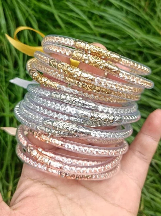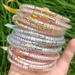 Sparkle up your style with the Buddha Thai Rhinestone Bracelet! This unique piece features a rhinestone bangle inside a clear bangle, giving it a subtle but eye-catching look. Elevate your outfit and add some Zen to your day with this charming bracelet. Bracelets are sold in singles.