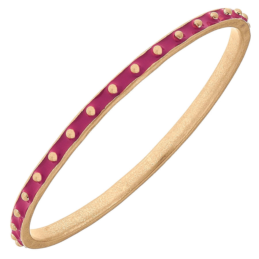 This captivating Aubrey Studded Bracelet is a show-stopper! Crafted with a fuchsia base metal and a worn gold plating, it radiates with a unique and vibrant enamel material. Its 3" diameter is perfect for offering a stand-out style statement. Dare to be different and make an unforgettable impression!