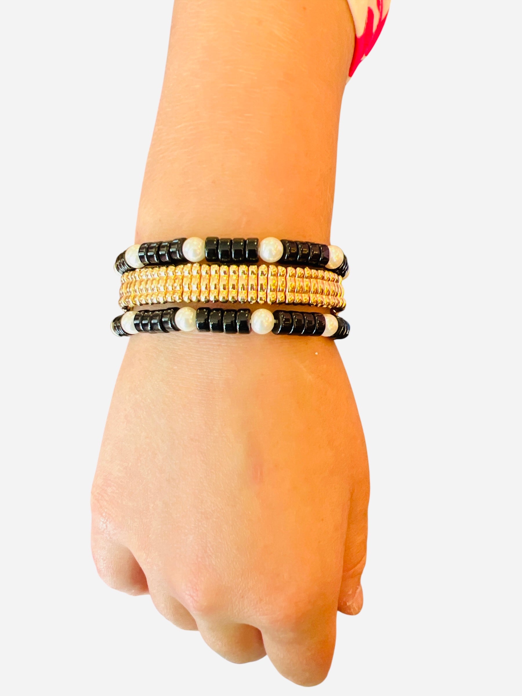 Two of the bracelets feature sleek black beads accented with luminous pearls — a timeless combo with a modern twist. The third bracelet adds warmth and shine with radiant gold beading, making the full set pop whether you wear them stacked or solo. Lightweight and easy to wear, their stretch-fit design ensures comfort and flexibility wherever the day takes you.