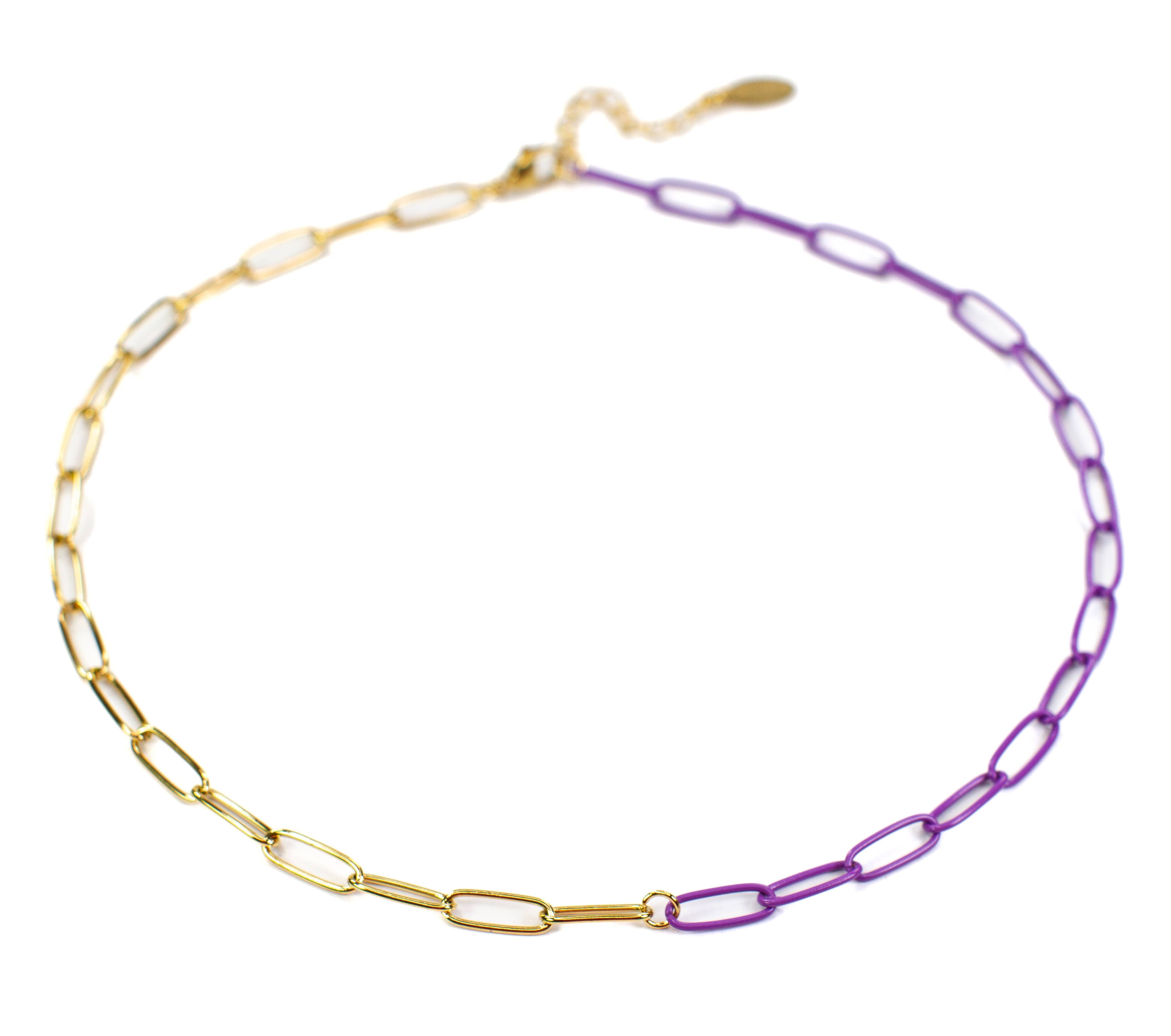 This charming necklace combines the classic elegance of gold with a playful pop of lavender. Hand-crafted using paperclip chain links, it adds a touch of fun to any outfit. Perfect for both everyday wear and special occasions. Upgrade your style with this unique piece!