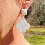 Delicate yet eye-catching, our Ice Geo Flower Acrylic Earrings bring a soft, feminine glow to any look. Measuring 1.88 inches, these elegant statement earrings feature a pearly square stud set in polished gold-tone hardware, offering a refined and modern starting point. Suspended below is a translucent quatrefoil-shaped drop, designed with a shimmering, crystal-like texture that catches the light beautifully with every movement. The icy, luminous finish gives these earrings an elevated look that feels both timeless and on-trend.