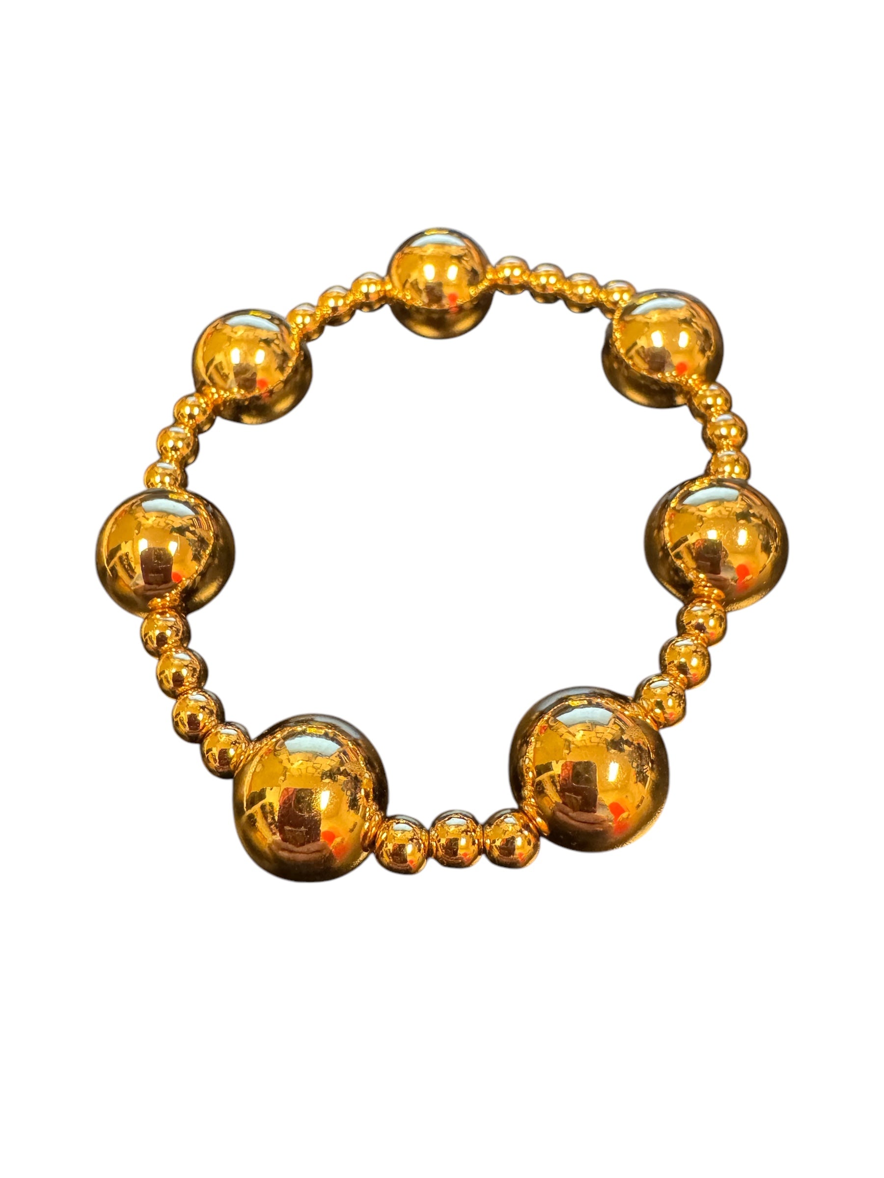 Add some shine to your wrist with this Gold Bracelet! Its water resistant feature makes it perfect for everyday wear. The stretchy design allows for easy on and off, while the mix of 12mm and 4mm beads adds a touch of uniqueness. So go ahead, make a statement with this stylish and practical bracelet.
