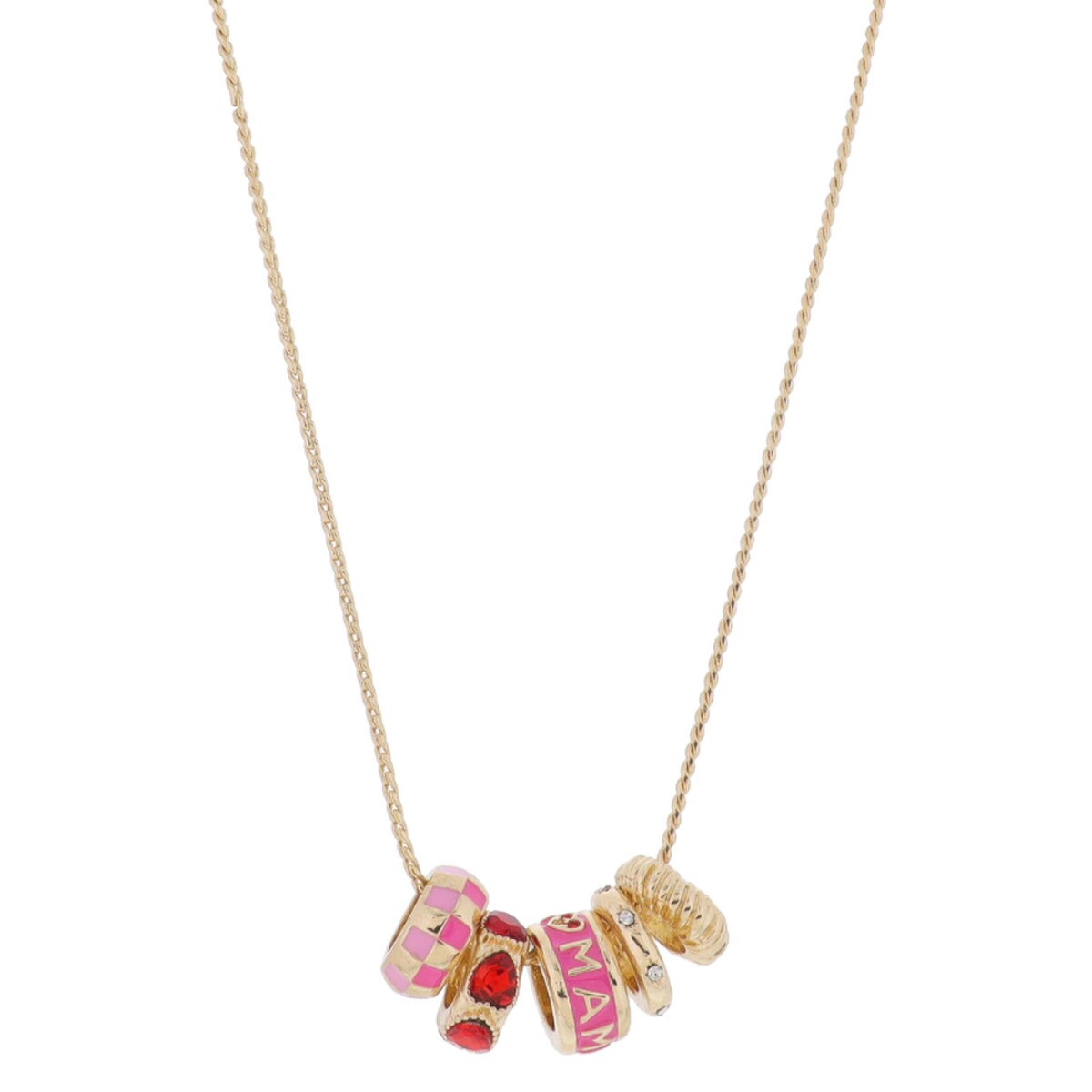 Make mama proud with this playful Gold Necklace! Adorned with multi pink enamel checkers, dainty red crystal hearts, and a hot pink enamel "mama" charm, it's the perfect mix of fun and chic. Plus, the textured gold rondel cluster adds a touch of sparkle with crystal starbursts.