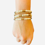 Three bracelets feature luminous faux pearls separated by shiny gold spacer beads, delivering classic sophistication with a modern twist. The remaining two bracelets are adorned with delicate all-gold beading, offering just the right amount of shimmer to balance the set. Wear them all together for a bold, layered look or mix and match to suit your vibe for the day.