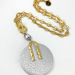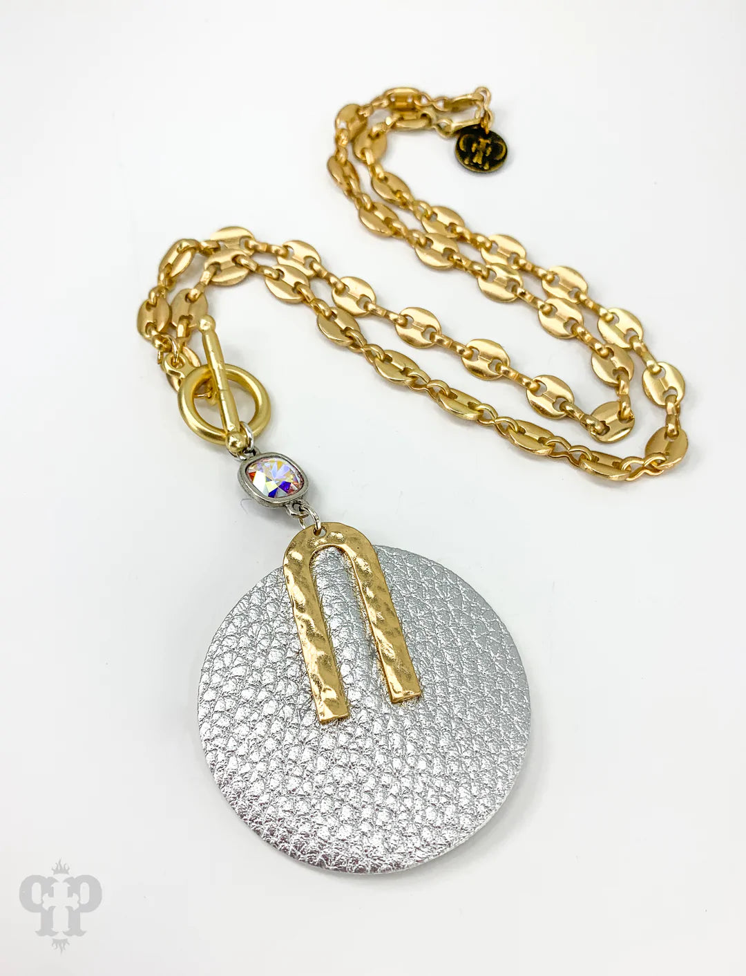 Matte gold mariner toggle front chain necklace with silver/AB 8mm cushion cut connector and silver leather circle pendant.
