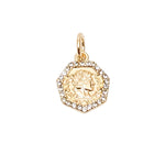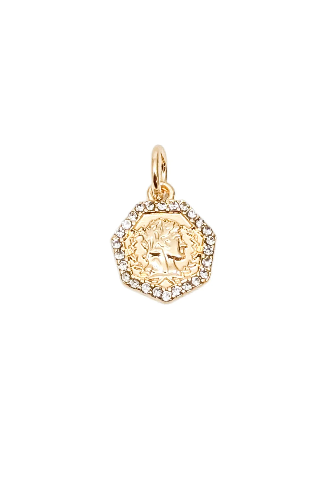 Gold octagen shaped coin necklace charm with rhinestones.