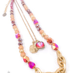 Mix color cut crystal and gold chain double layer necklace with 12 mm bronze & hot pink cushion cut drop.