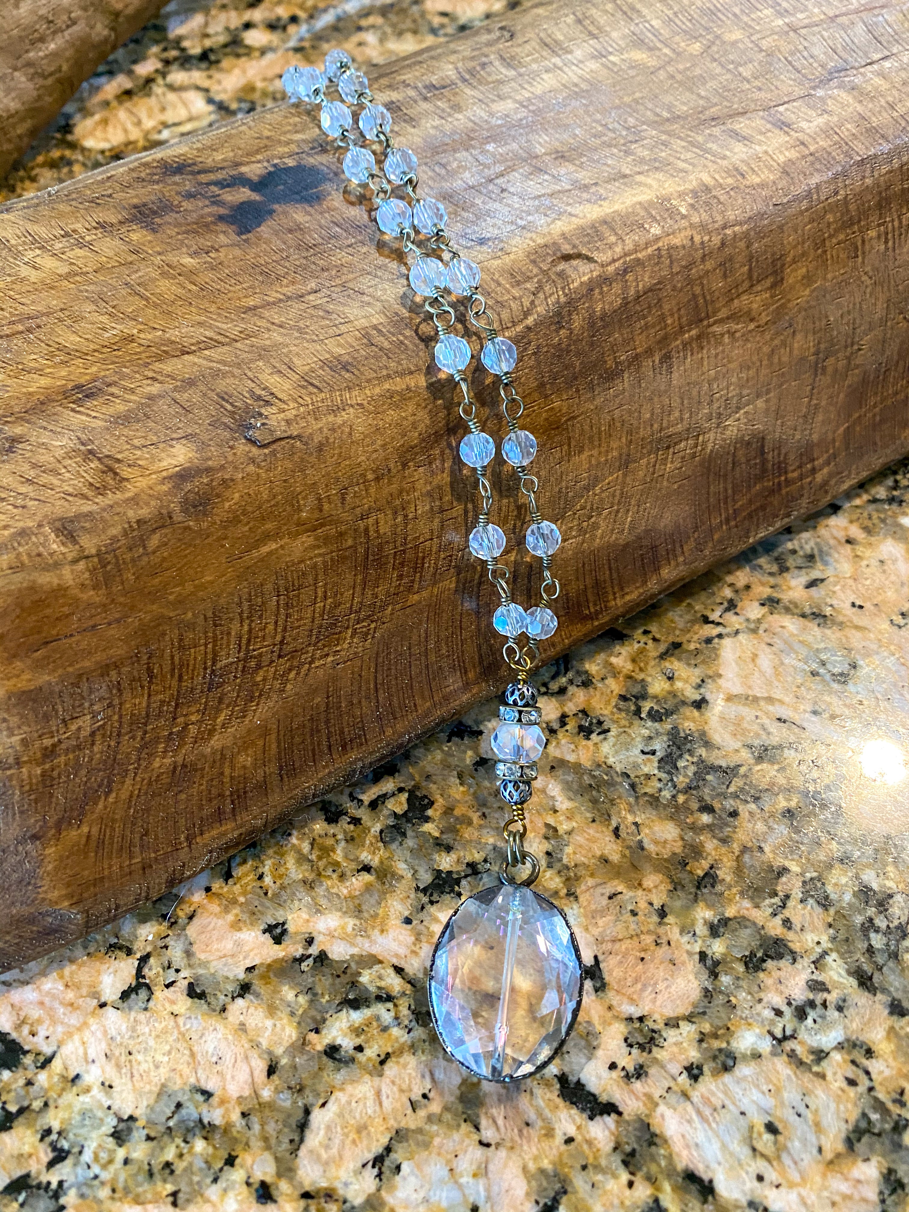 Necklace is iridescent beads on antique gold links with a large pendant. We also have matching Iridescent Crystal Earrings.