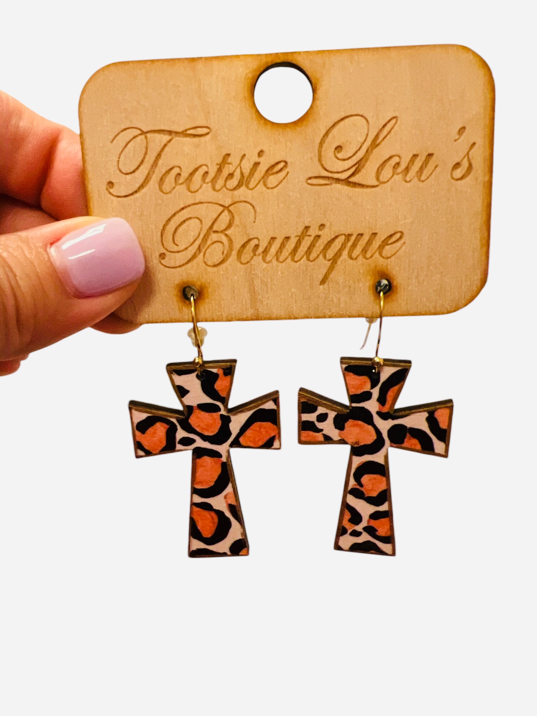 Show off your wild side with our Leopard Cross Dangle Earrings, a bold blend of faith and fashion. These lightweight statement earrings feature a trendy leopard print design in warm orange and black tones, perfectly shaped into an elegant cross silhouette. The eye-catching animal print adds a touch of modern edge, while the dangle style gives beautiful movement and shine. Ideal for everyday wear or dressing up your outfit, these leopard print cross earrings pair effortlessly with denim, dresses, or your favorite boutique looks. Comfortable for all-day wear, they make the perfect gift for leopard lovers and trendsetters alike. Add these earrings to your jewelry collection for a fierce yet faith-inspired touch.