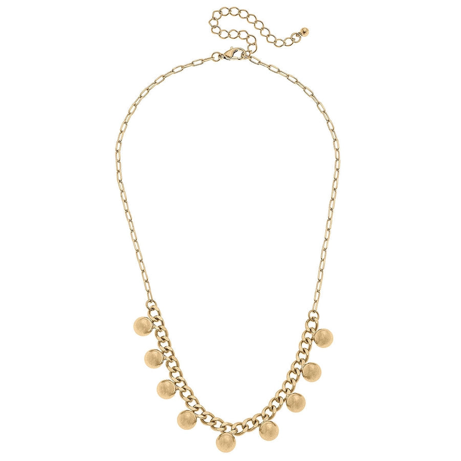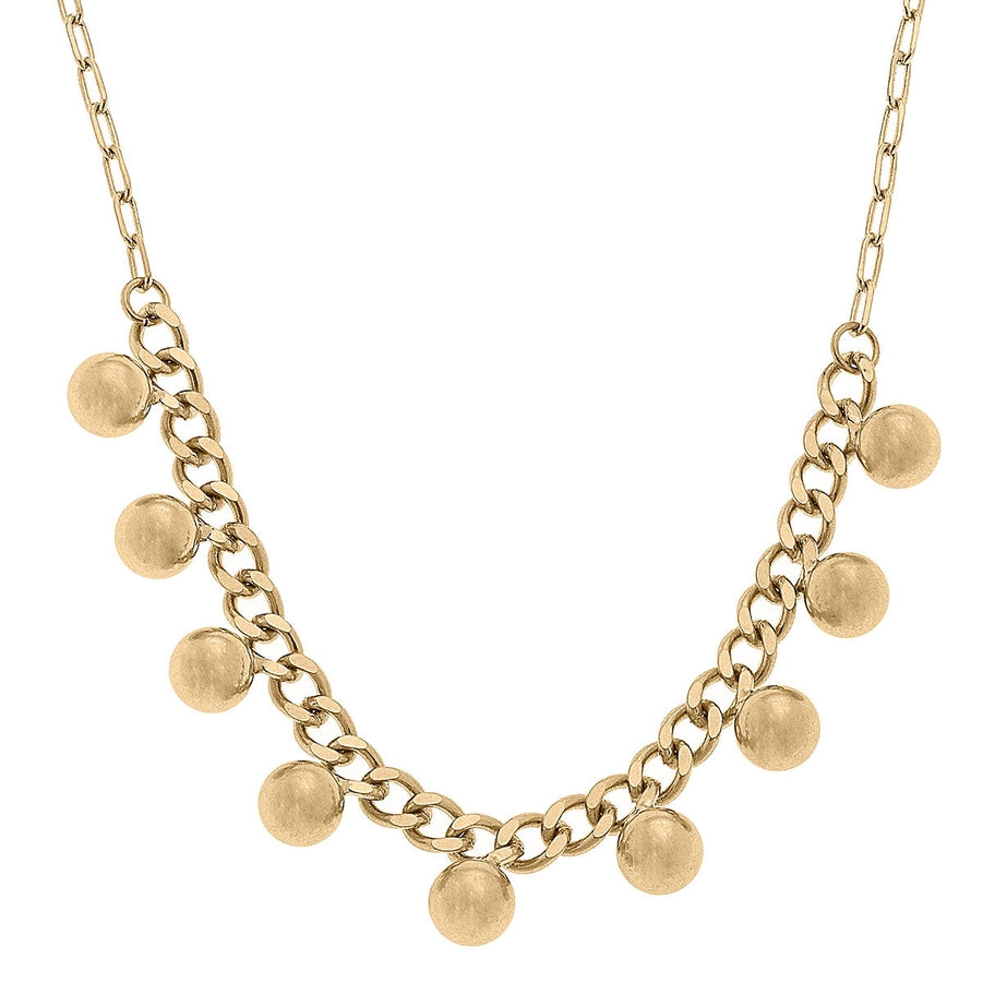 Crafted from a polished base metal with worn gold plating, the Lizzie Delicate Ball Bead Drip Necklace is an elegant addition to any style. An adjustable 16" chain with a 3" extender is connected with a lobster claw closure, creating a classic staple piece with subtle sophistication.