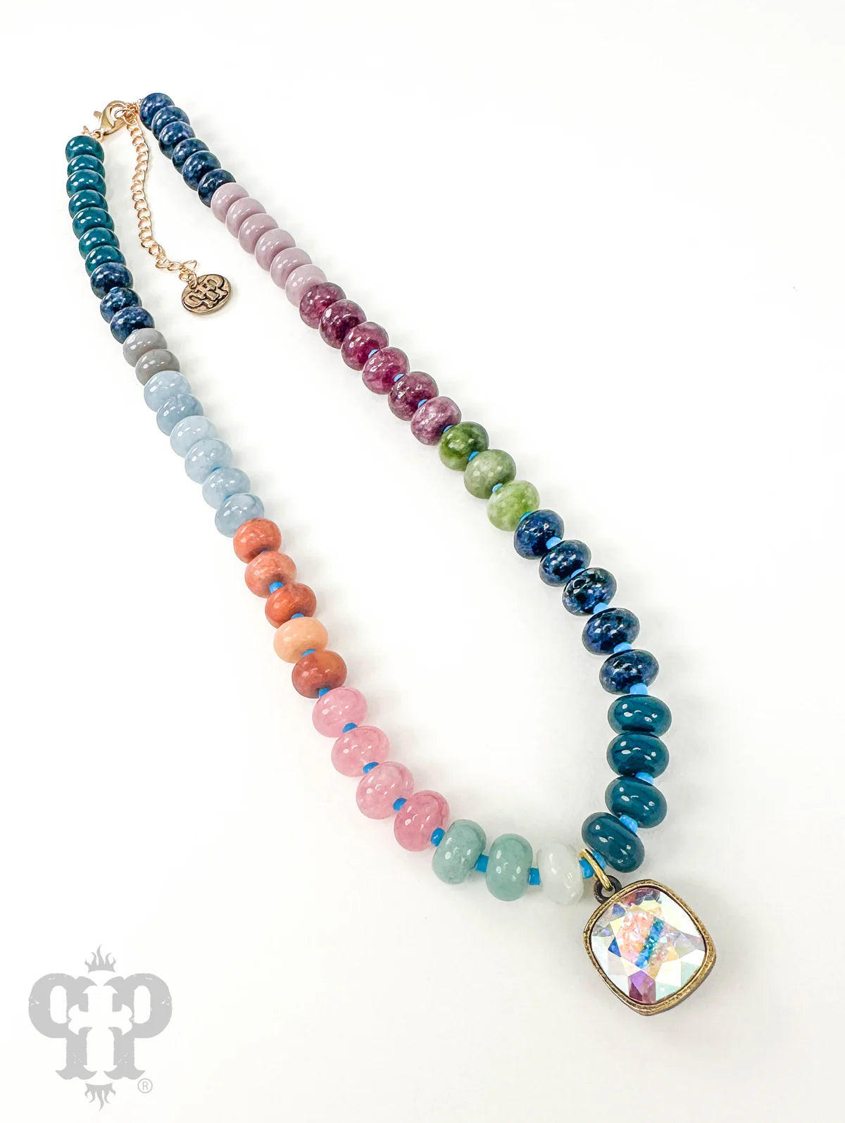 Elevate your look with our multi color stone necklace. Each bead features a unique, iridescent shine, while the pendant adds a touch of moodiness with its darker tones. Embrace the luxury of versatility and style with this exclusive piece.