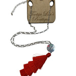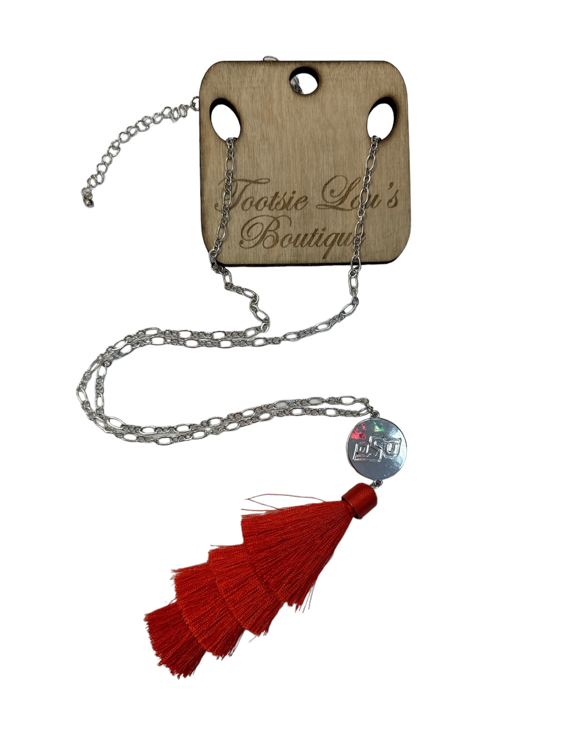 Complete your game day look with this OSU Tassel Necklace! Featuring a bold orange tassel and an OSU charm, this necklace is the perfect accessory for any die-hard fan. Show off your team spirit in style!