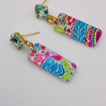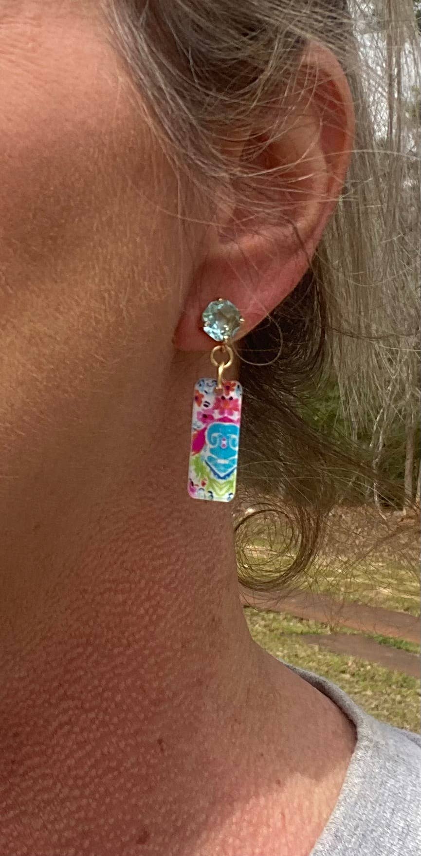 Add a playful pop of color and pattern to your everyday accessory lineup with our Paisley Stick Baby Dangle Earrings. Measuring 1.57 inches, these lightweight statement earrings are designed to deliver eye-catching style in a perfectly wearable size. Each pair features a sparkling light blue–faced crystal stud that adds a touch of shimmer at the top, beautifully complemented by a slim rectangular drop below. The drop showcases a vibrant multicolor floral and paisley-inspired pattern, blending cheerful shades of blue, pink, green, and coral for a fun, artistic look.