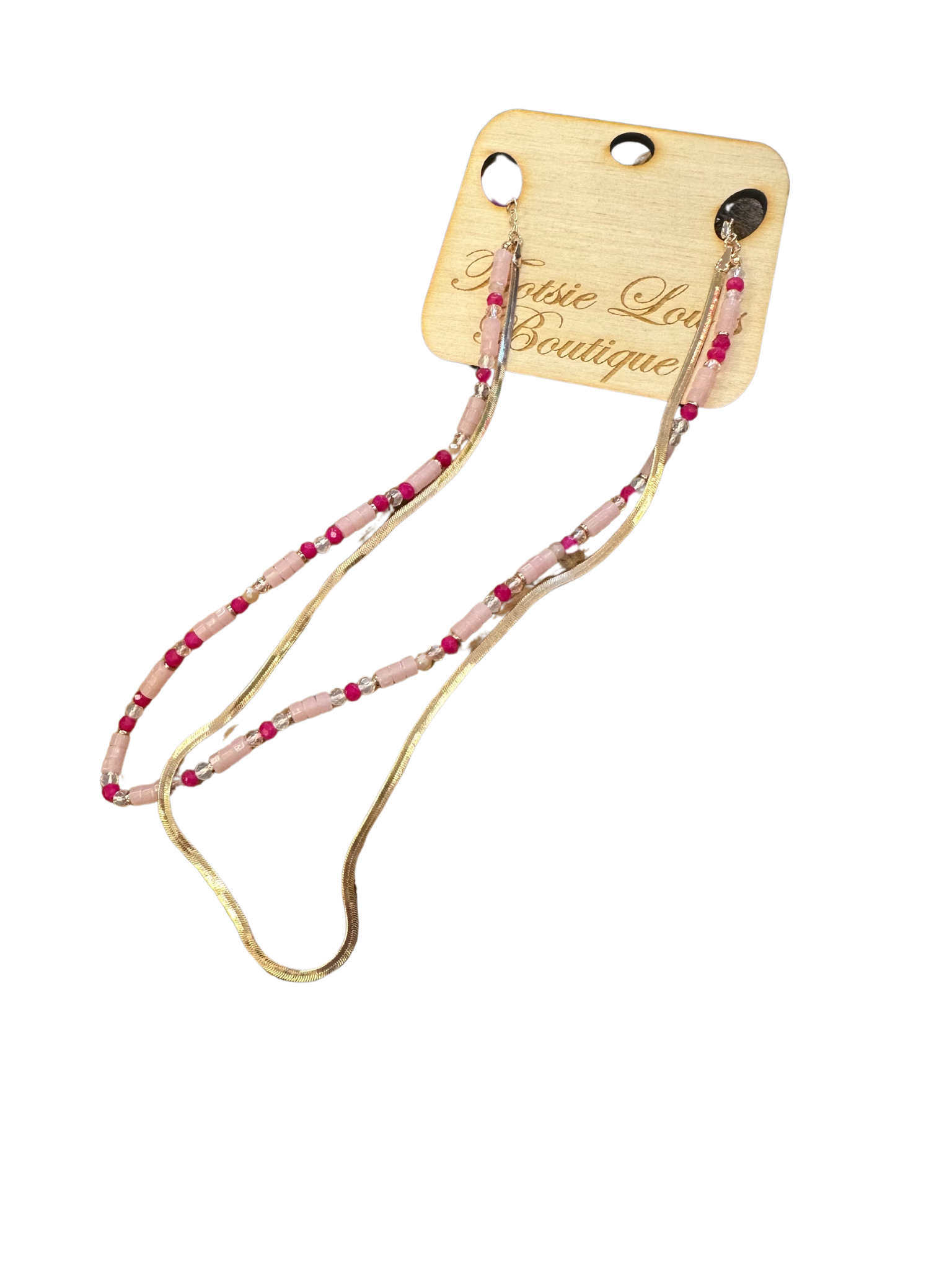 Add a pop of color to your jewelry collection with this Pink Beaded Gold Chain Necklace. The playful pink beads contrast beautifully with the elegant gold chain, making it a perfect accessory for any outfit. (Get ready to make a statement with this quirky necklace!)
