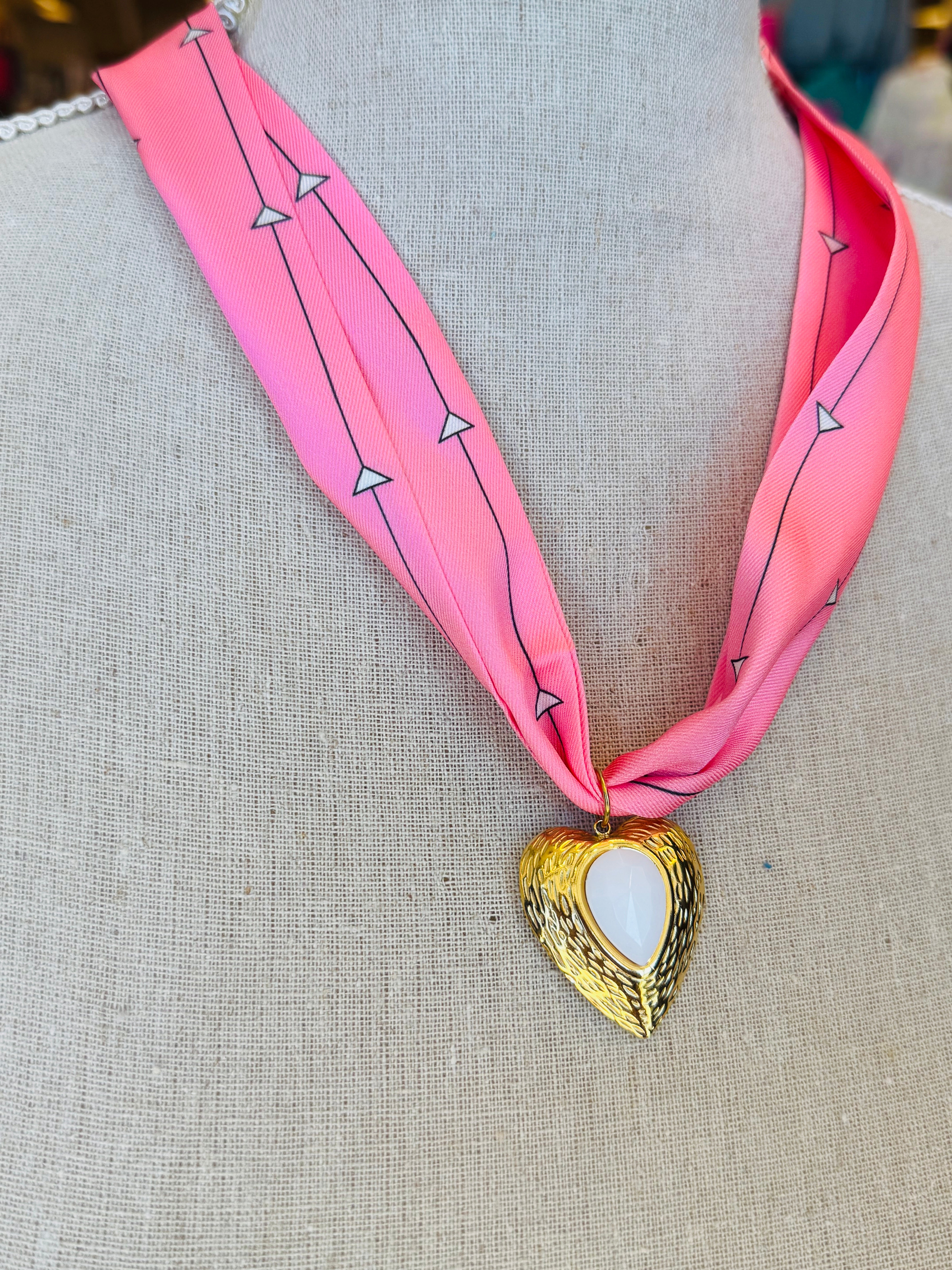 Close-up of a pink printed scarf-style necklace featuring a gold heart charm with a smooth white stone center, styled on a white background for a soft and elegant presentation.
