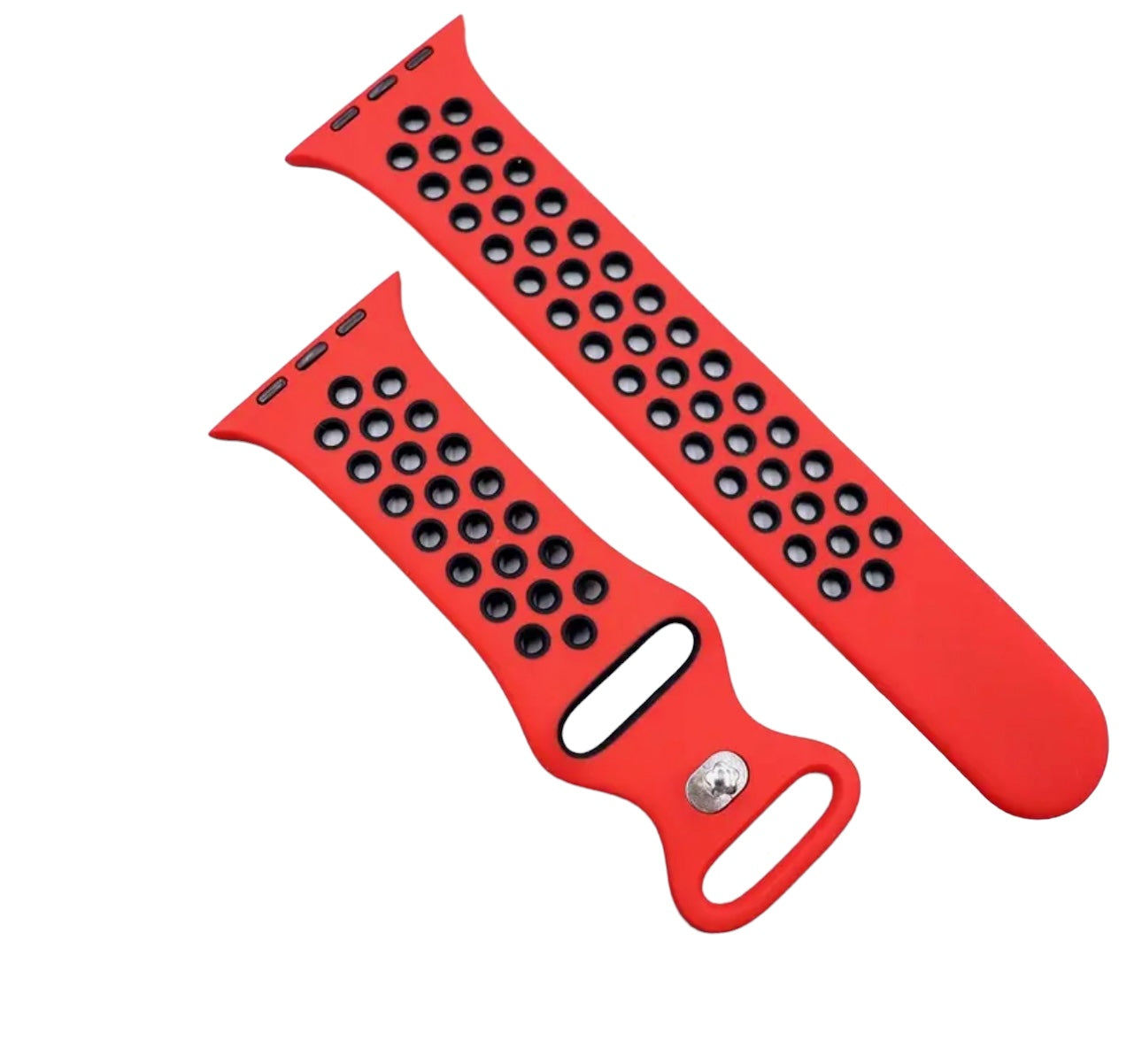 Set your style apart with our Red & Black Apple Watch Band. Made from red silicone with bold, red rimmed circles, this band adds a playful pop of color to your wrist. Upgrade your look and stand out from the crowd!
