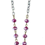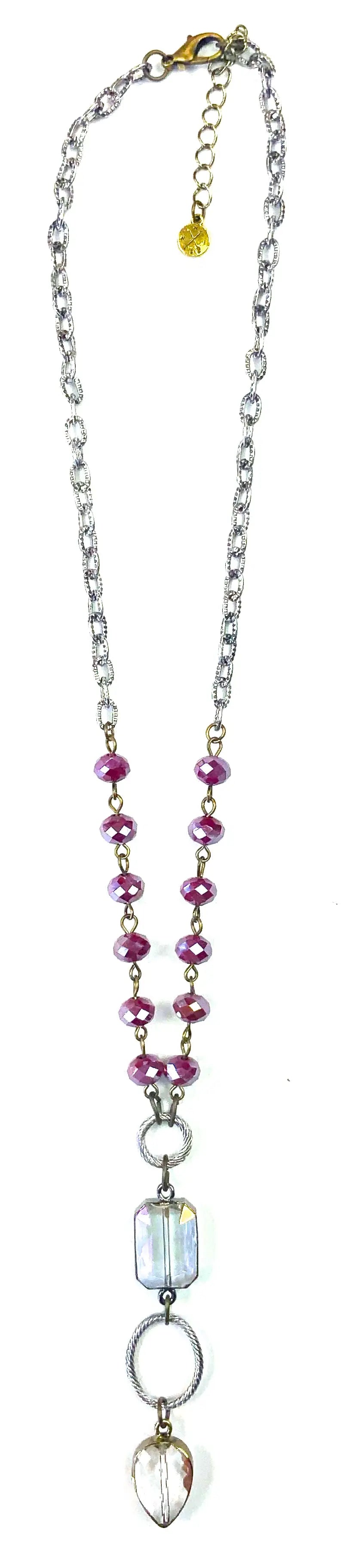 Silver chain and rose rosary beads with a rhinestone dangle pendant. Great for layering!