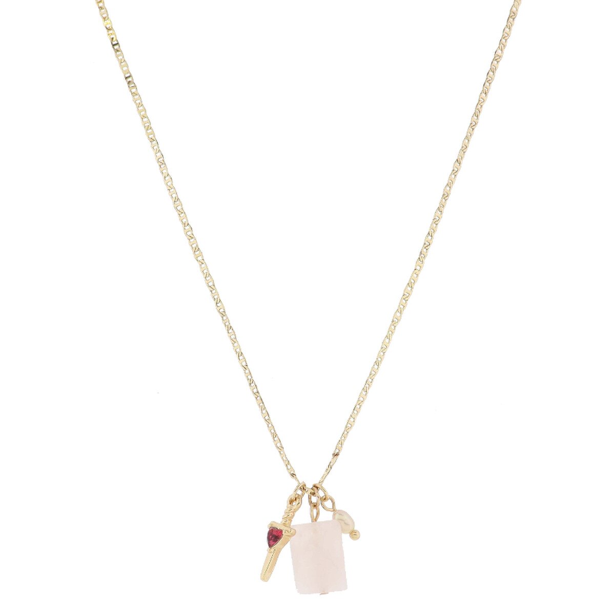 Add some charm to your outfit with our Rose Pendant Necklace! Featuring a gold sword adorned with a pink crystal heart, a rose quartz rectangle, and a pink pearl necklace. Perfect for the dreamy and playful fashionista.