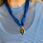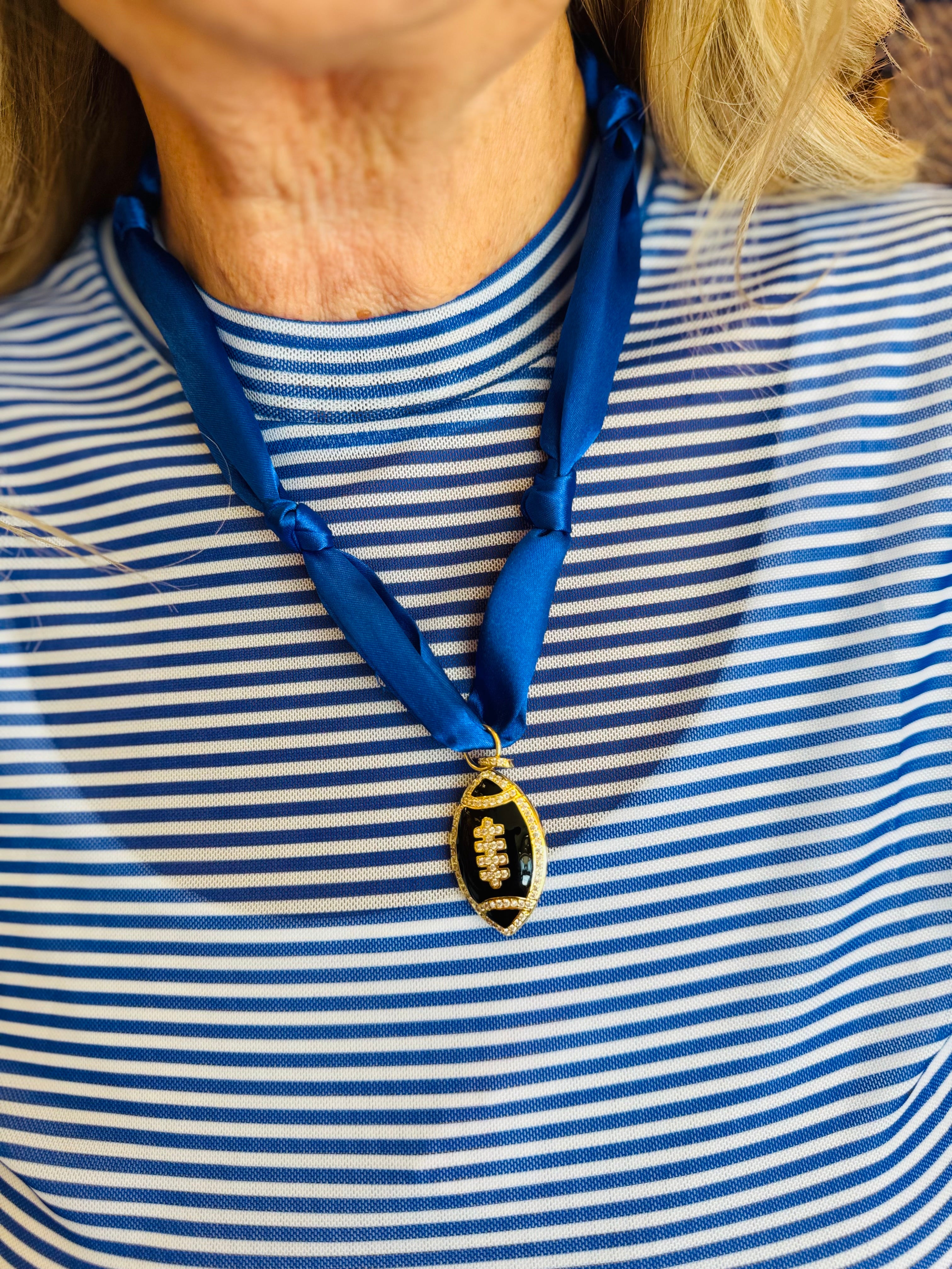 Bring bold color and sparkle to your game-day look with our Royal Blue Satin Scarf Necklace—the ultimate accessory for stylish sports fans. Made from smooth, luxurious royal blue satin, this versatile scarf is knotted into a chic necklace and finished with a gold-plated enamel black football charm encrusted with dazzling rhinestones. The eye-catching charm adds a touch of glamour while still showing your team spirit.