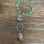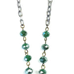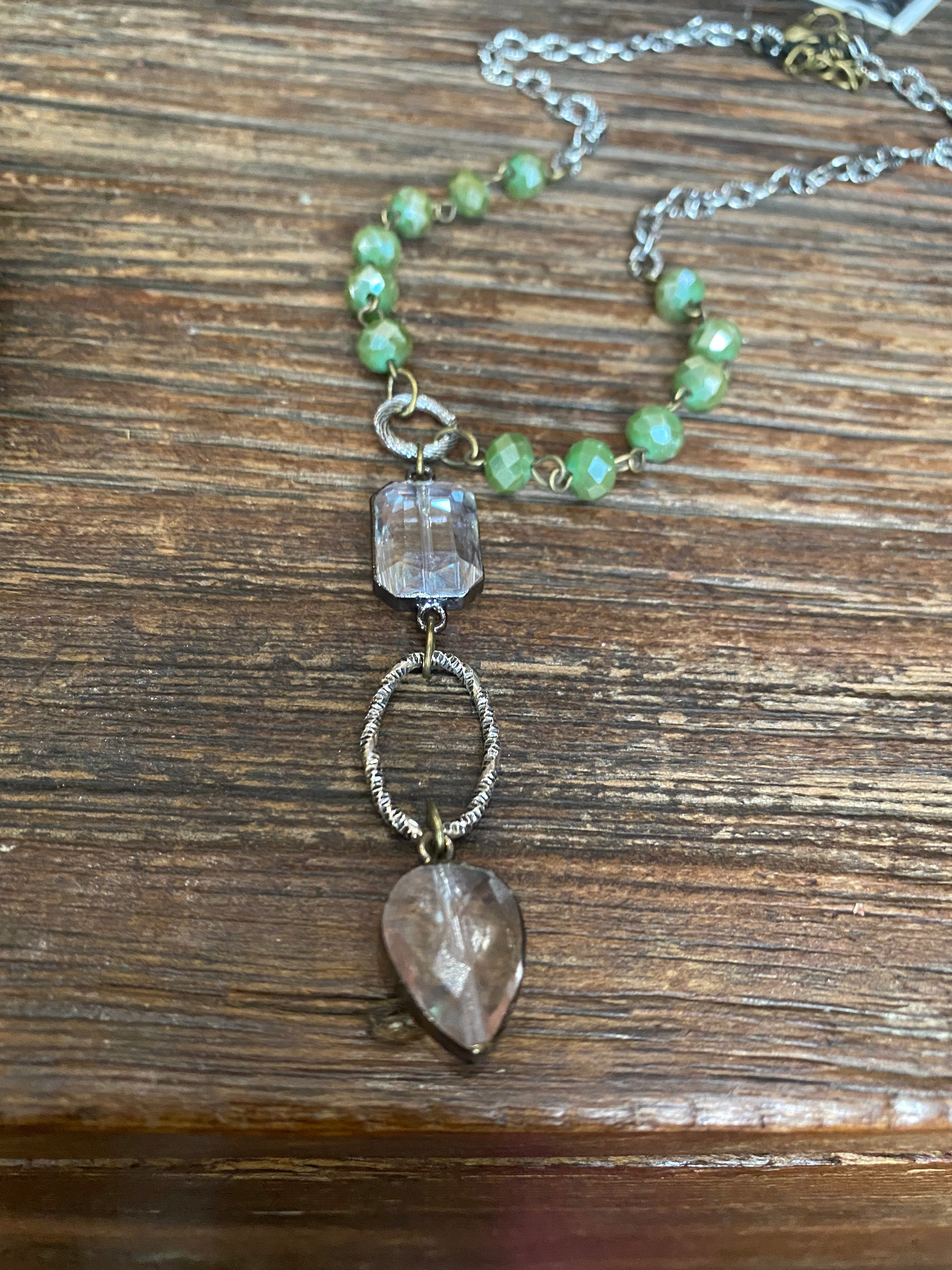 Silver chain and sage green rosary beads with a rhinestone dangle pendant. Great for layering!