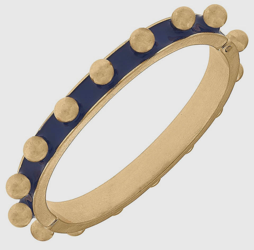 This Jenna Chunky Studded Bangle in Blue is a striking piece of jewelry crafted from base metal with a worn gold and blue enamel plating. The 3” diameter offers a unique blend of style and comfort.