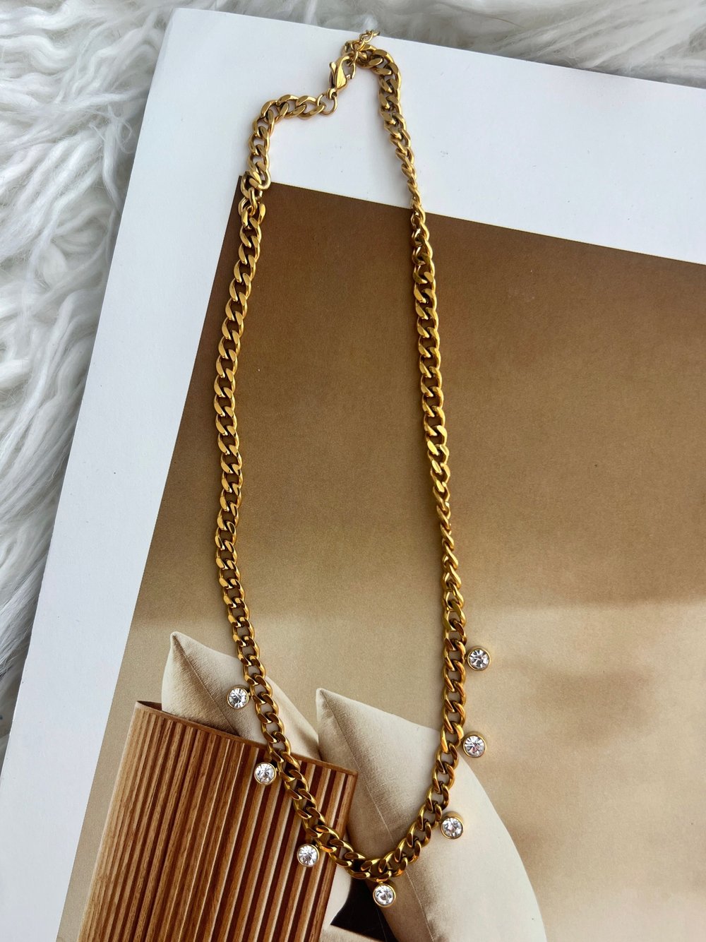 Add some sparkle to your life with the Zoe Necklace, featuring gold chain and diamond rhinestone pendants. With a lifetime warranty and water-resistant design, this statement piece is the perfect combination of style and durability.