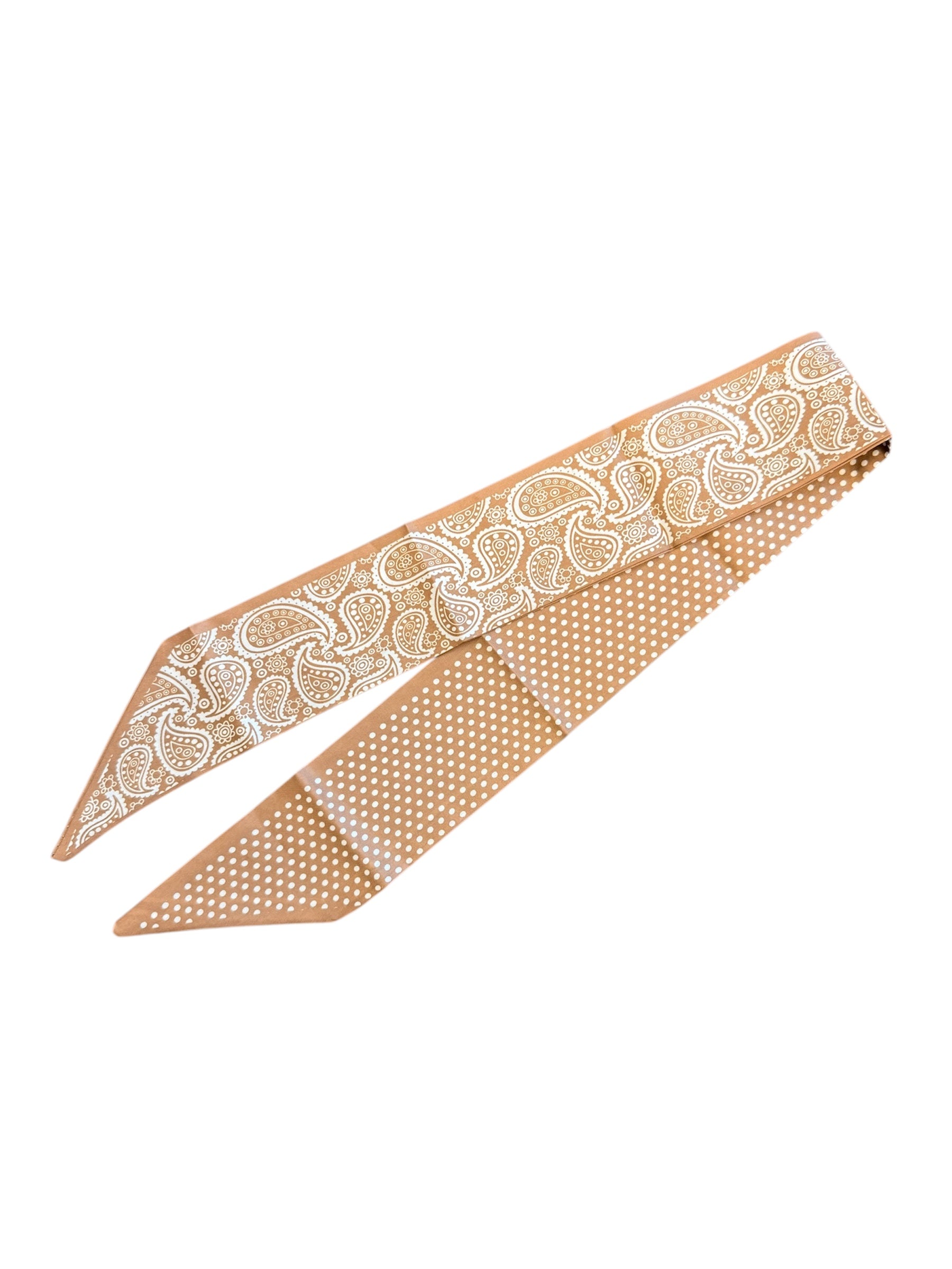This charming brown scarf tie is a stylish and versatile accessory that offers two distinctive looks. One side features classic white polka dots on a light brown background, while the other side showcases a subtle bandana design, adding a soft, vintage touch. Perfect for accessorizing handbags, this scarf doubles as a purse twilly or handbag accessory. Whether tied around your bag’s handle, your neck, or wrist, it’s lightweight and easy to style, offering endless possibilities to enhance your look. This scarf is the perfect combination of practicality and style, ideal for those who appreciate unique, functional accessories.