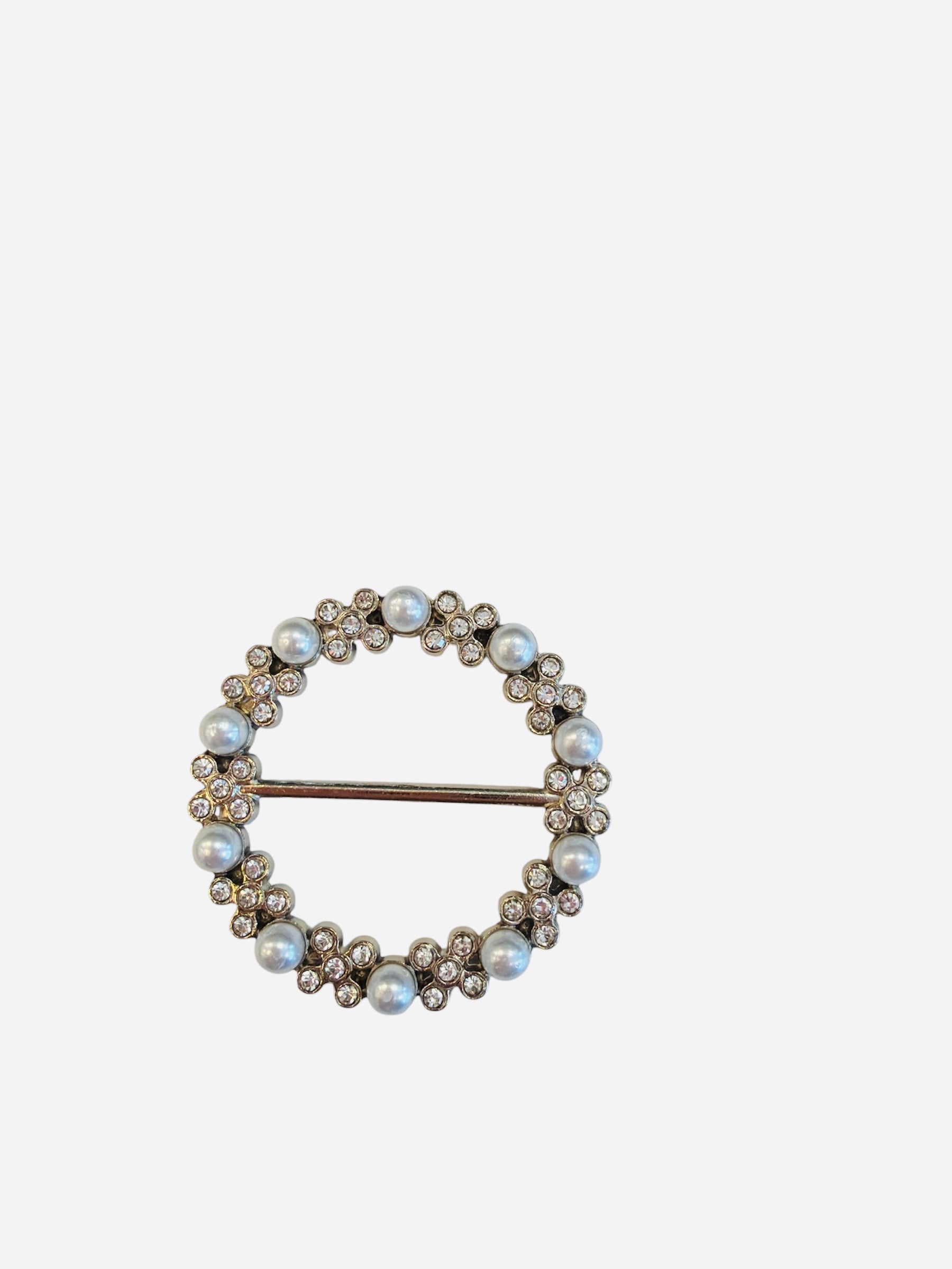 Elevate your accessory collection with this stunning round scarf slide, a versatile piece designed to secure scarves with elegance while adding a touch of sparkle. Crafted in a polished silver-tone finish, this chic accessory is beautifully detailed with alternating pearl accents and rhinestones for a refined, sophisticated look. Small rhinestone clusters form a delicate, floral-inspired pattern, creating subtle shimmer and feminine charm that catches the light beautifully.