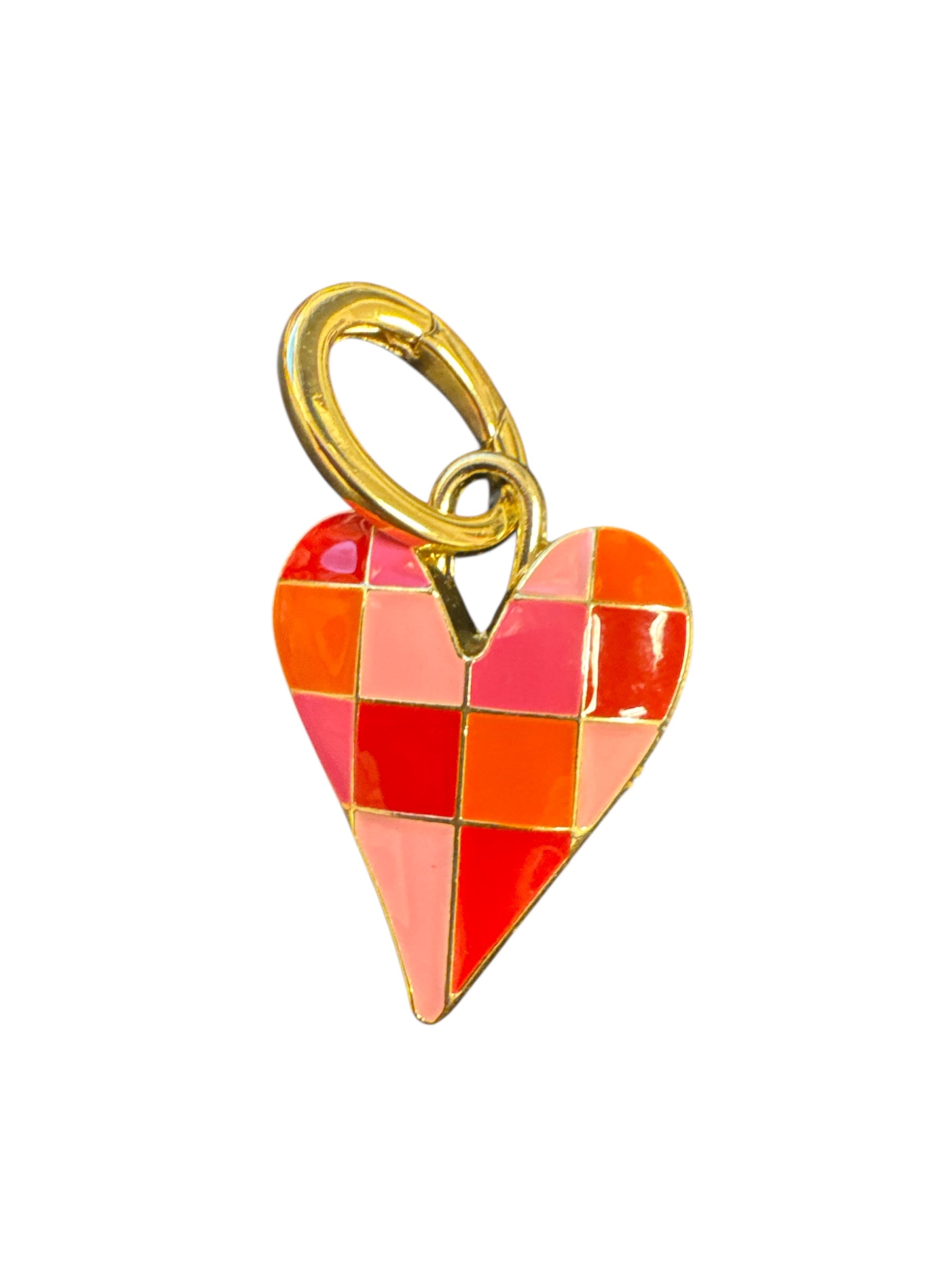 Heart-shaped charm with pink, coral, and red checkered enamel