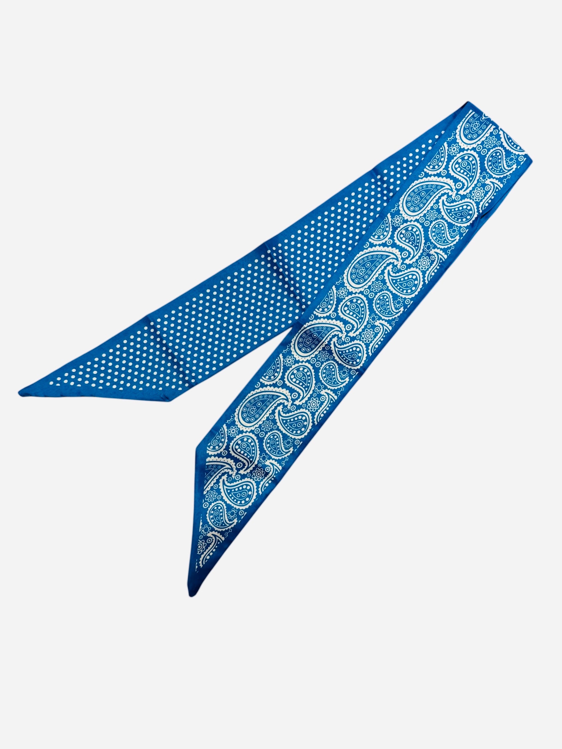 Add a playful touch of sophistication with the Royal Blue Polka Dot & Bandana Double-Sided Scarf Tie. Measuring 34 inches in length, this beautifully crafted satin scarf tie offers two chic looks in one—classic white polka dots on rich royal blue on one side, and a timeless bandana-inspired print on the other. The silky finish drapes elegantly whether you wear it as a neck scarf, knot it and add a charm for a trendy scarf necklace, or wrap it around your handbag handle as a stylish purse twilly. Lightweight, versatile, and effortlessly chic, this accessory transitions seamlessly from casual days to polished evenings, making it a must-have in every wardrobe.