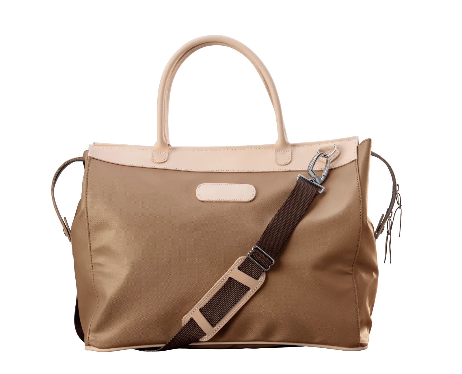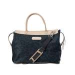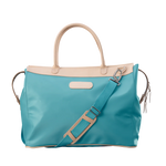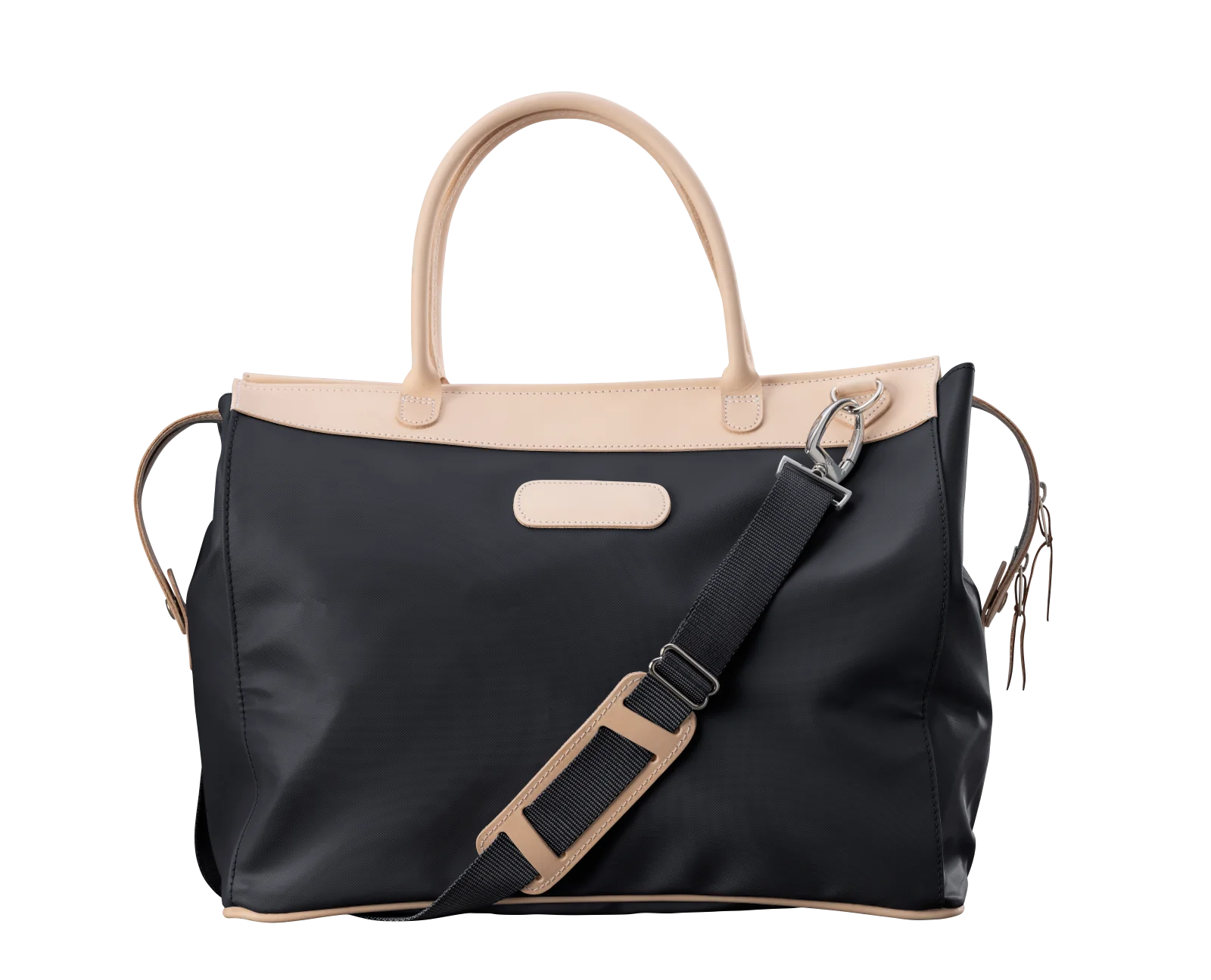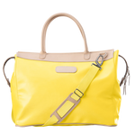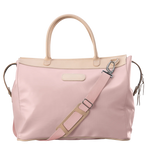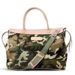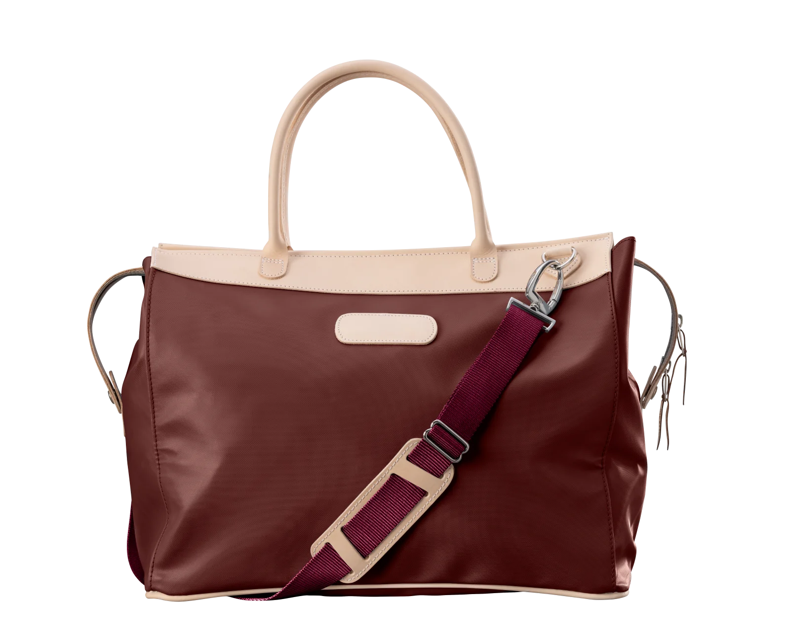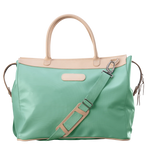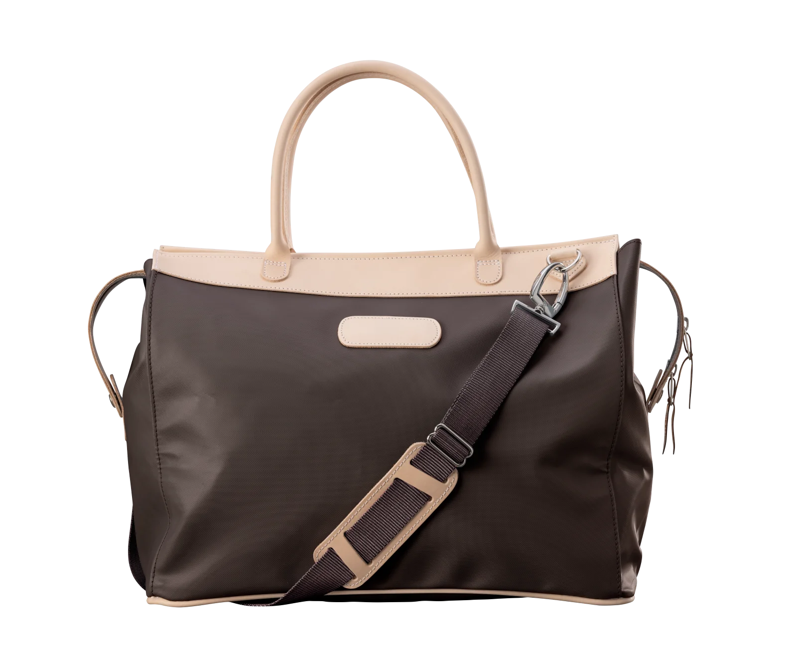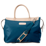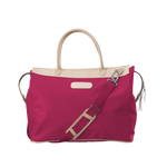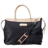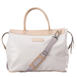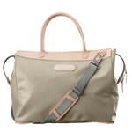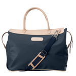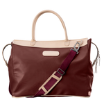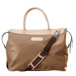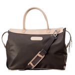 Discover the perfect balance of style and function with the Jon Hart Burleson Bag, a timeless travel companion designed for both short getaways and long weekends. Crafted from durable coated canvas and accented with premium natural leather trim, this bag is built to last while maintaining an effortlessly classic look. The spacious interior offers plenty of room for clothing, shoes, and essentials, while a zippered pocket inside helps keep smaller items organized. A back exterior zippered pocket adds quick access to travel must-haves. The fully zippered closure with silver hardware ensures your belongings stay secure, while natural leather handles and a detachable webbing crossbody strap provide multiple carrying options. Finished with a leather-trimmed base and silver feet for extra durability, the Jon Hart Burleson Bag is the perfect choice for stylish, organized travel.