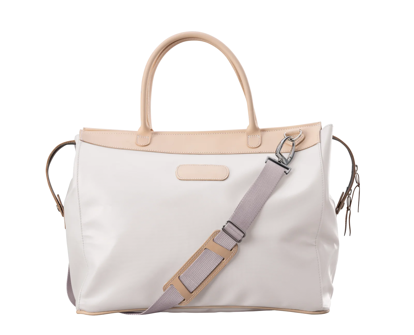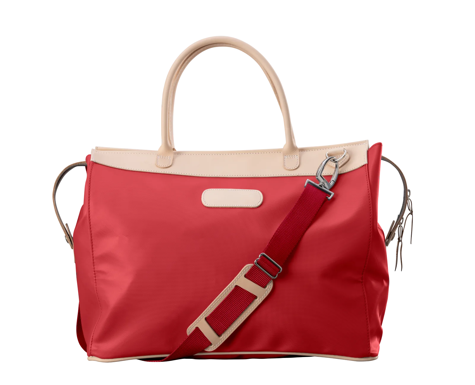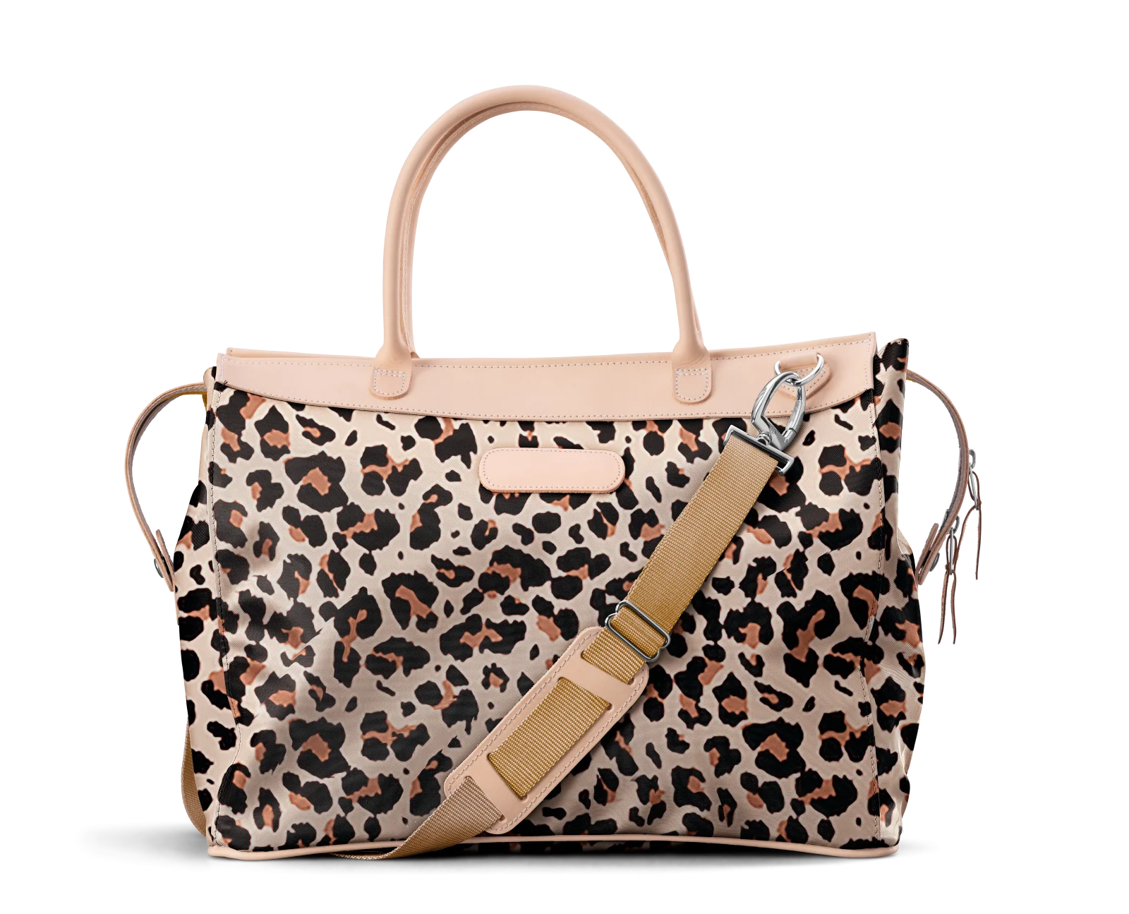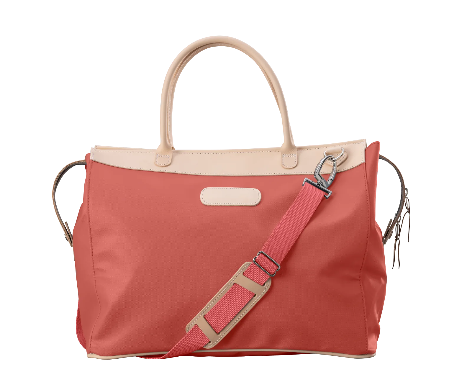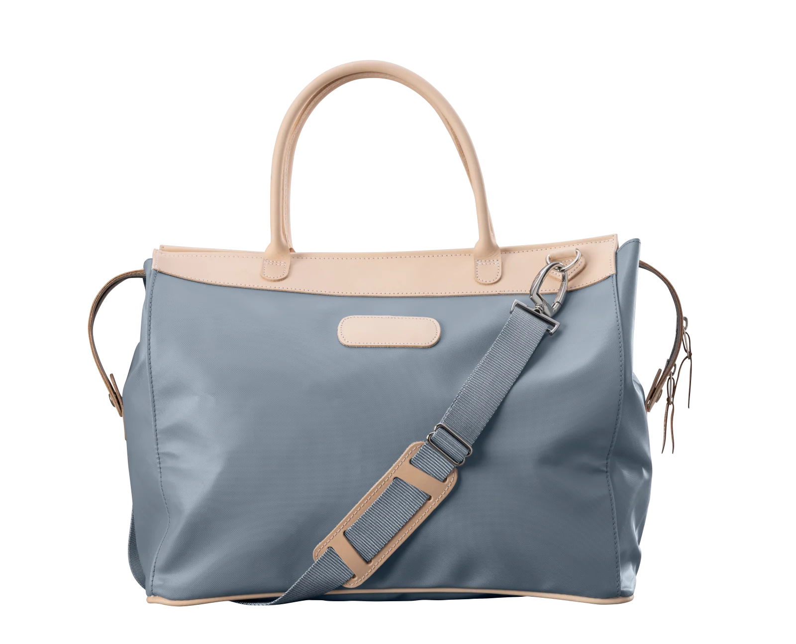 Discover the perfect balance of style and function with the Jon Hart Burleson Bag, a timeless travel companion designed for both short getaways and long weekends. Crafted from durable coated canvas and accented with premium natural leather trim, this bag is built to last while maintaining an effortlessly classic look. The spacious interior offers plenty of room for clothing, shoes, and essentials, while a zippered pocket inside helps keep smaller items organized. A back exterior zippered pocket adds quick access to travel must-haves. The fully zippered closure with silver hardware ensures your belongings stay secure, while natural leather handles and a detachable webbing crossbody strap provide multiple carrying options. Finished with a leather-trimmed base and silver feet for extra durability, the Jon Hart Burleson Bag is the perfect choice for stylish, organized travel.
