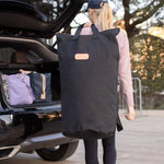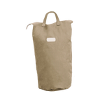 Cotton Canvas with Natural Leather trim. Zipper closure with webbing handle and two straps for easy carrying. Not designed to wash or hold wet clothes.