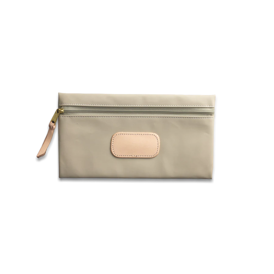 Simplify everyday organization with the Jon Hart Large Pouch, a sleek and versatile accessory designed to keep small essentials secure and easy to find. Crafted from durable coated canvas and finished with natural leather details, this slim pouch offers timeless style with lasting quality. Its flat, lightweight design makes it perfect for slipping into a tote, backpack, or carry-on while holding cosmetics, tech accessories, important documents, or travel necessities. A convenient size of 6" H x 11" W x 0.25" D provides just the right amount of space without adding bulk. Choose from classic coated canvas colors or opt for the clear version to easily see contents at a glance. Whether for daily errands, travel, or gifting, the Jon Hart Pouch delivers chic simplicity and practical organization.