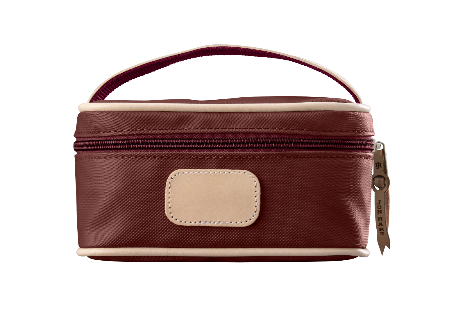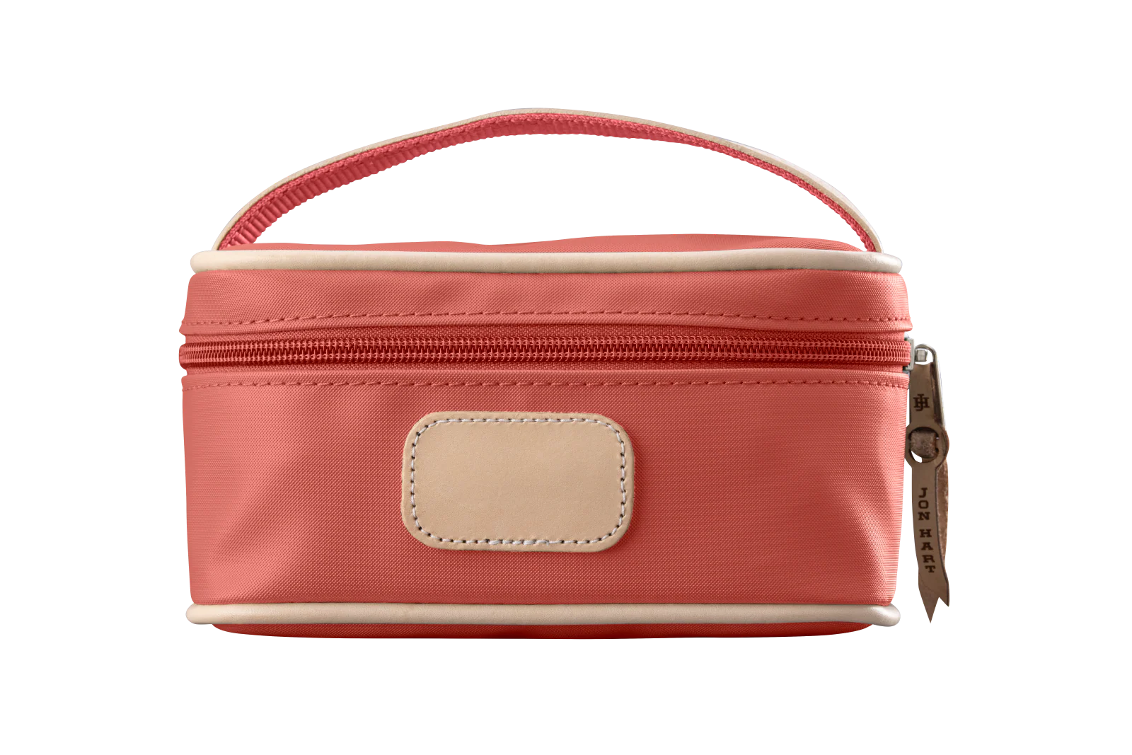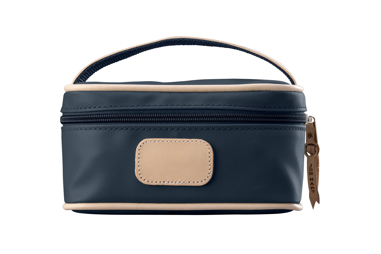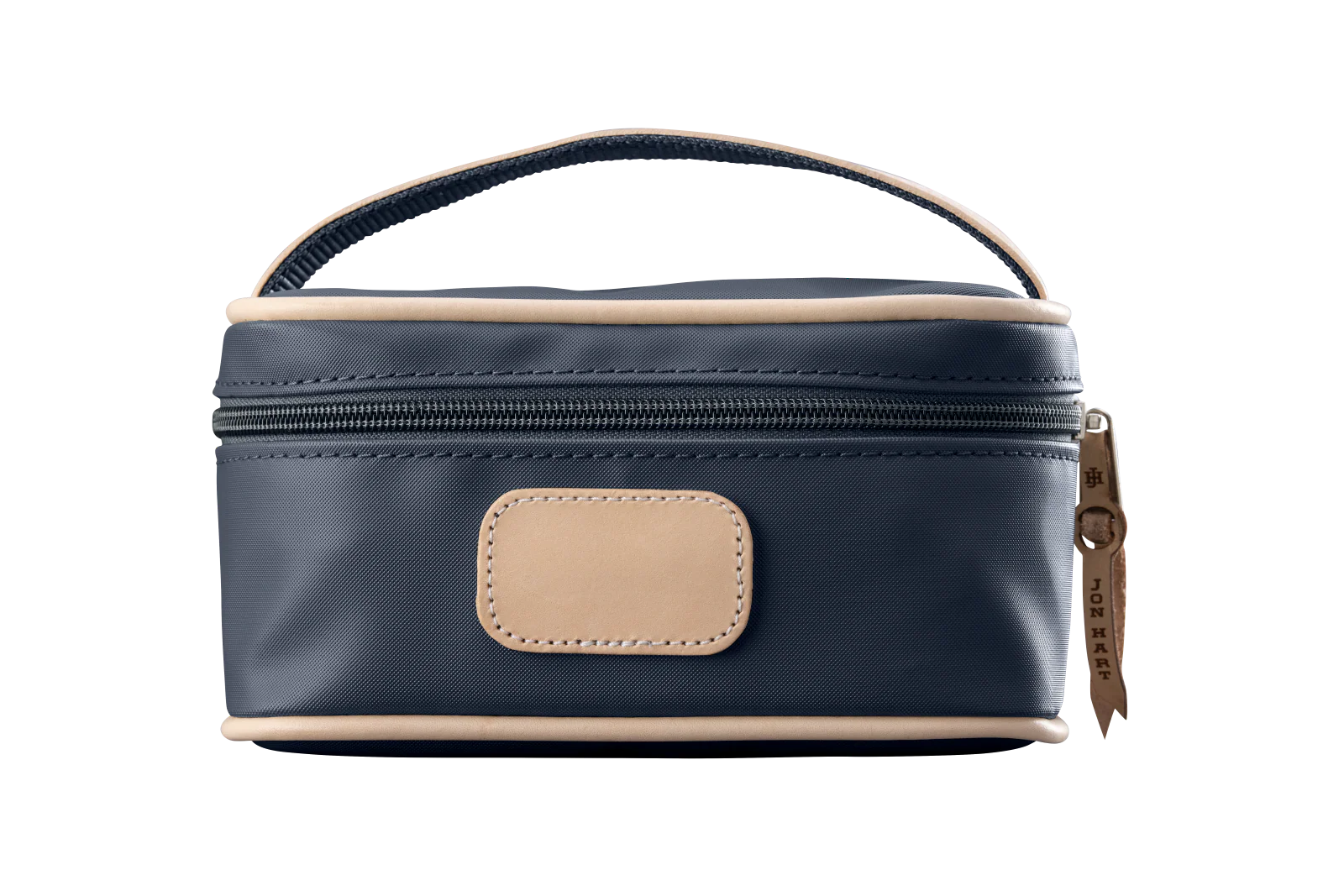 Keep your beauty and travel essentials stylishly organized with the Jon Hart Mini Makeup Bag, a compact companion designed for life on the go. Perfectly sized to hold just the right amount of makeup, medicine, or even a camera lens, this sleek bag delivers both fashion and function. Crafted from durable coated canvas and accented with natural leather trim, it offers timeless appeal and lasting quality. A zippered closure with silver hardware keeps items secure, while an interior pocket keeps small accessories in place. The webbing and natural leather handle make it easy to grab and carry solo or toss into a larger tote or suitcase. Ideal for day trips, weekend getaways, or everyday use, the Jon Hart Mini Makeup Bag makes staying organized effortlessly stylish.