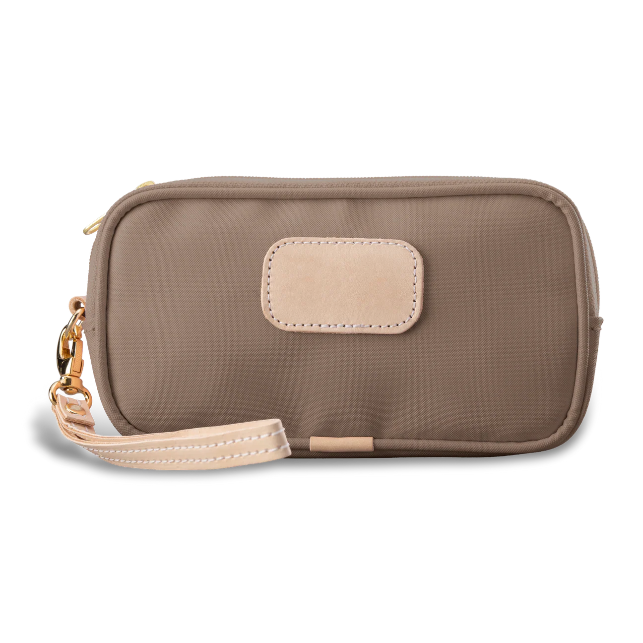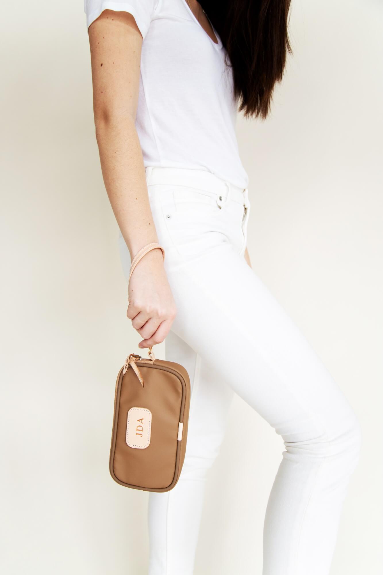 Enjoy fun and function in one compact design with the Jon Hart Wristlet, the perfect bag for life on the go. This versatile accessory provides plenty of room for large cell phones, key fobs, sunglasses, and small essentials, making it an ideal companion for errands, evenings out, or travel. Crafted from durable coated canvas and finished with natural leather trim, it blends timeless elegance with everyday practicality. The fully lined interior, featuring the JH logo print, includes both an open pocket and a zippered pocket to keep belongings organized and secure. A zippered closure with silver hardware adds extra protection, while the detachable natural leather wrist strap offers styling flexibility—carry it solo as a clutch or slip it inside a larger tote. Personalized and handmade with care, the Jon Hart Wristlet delivers durable beauty and effortless style.