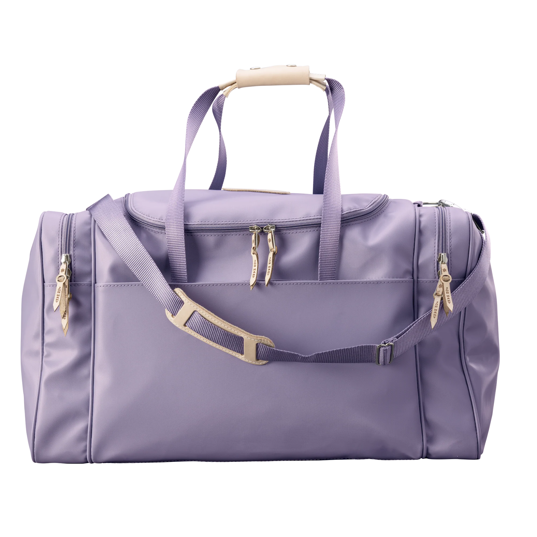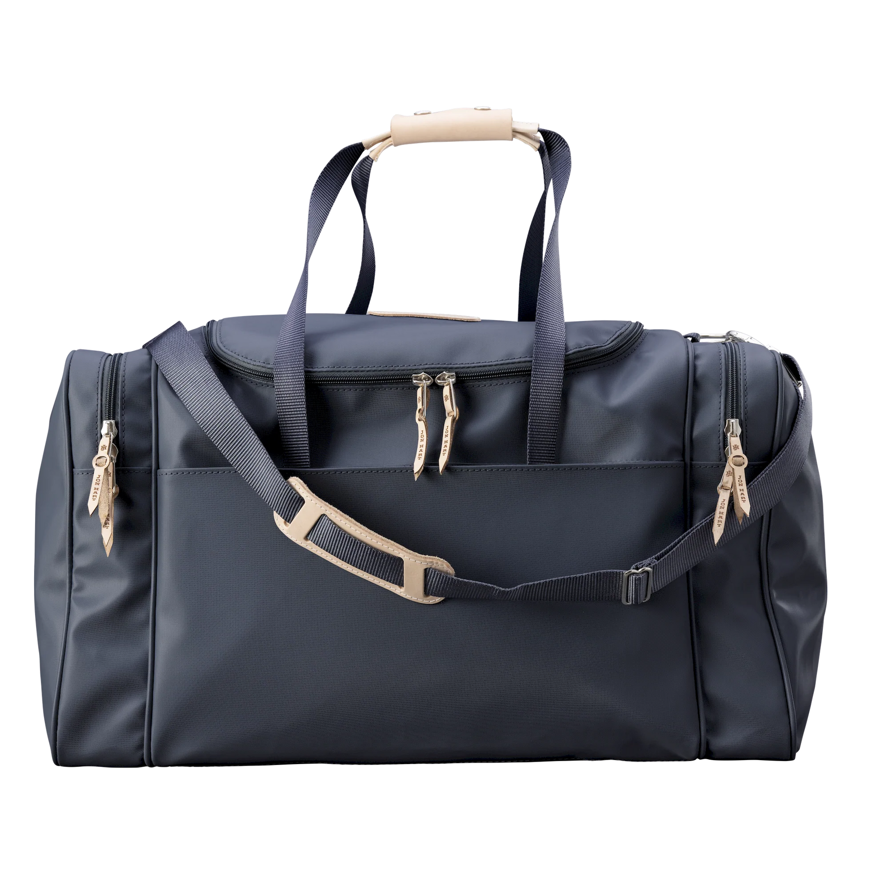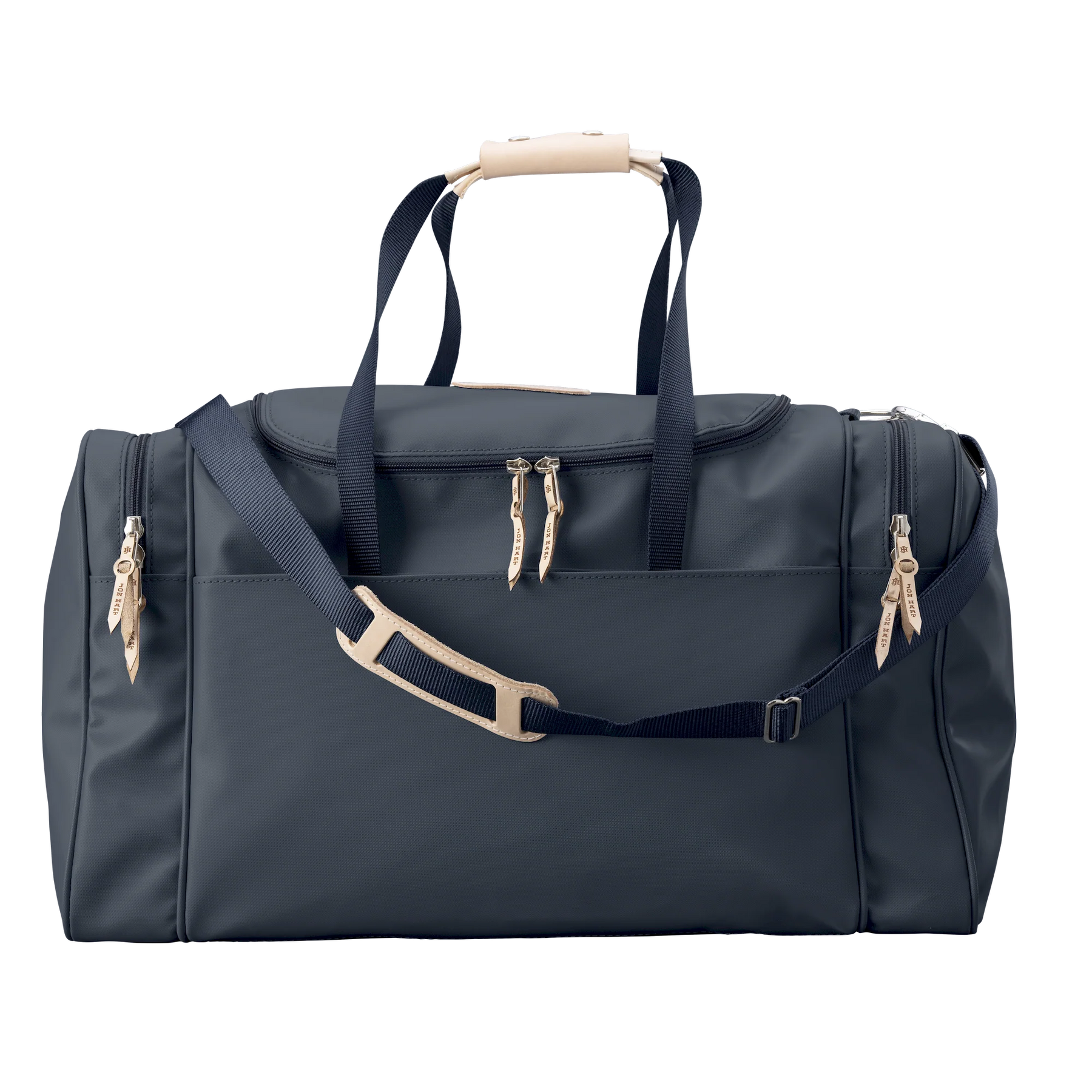 Travel in style and stay organized with the Jon Hart Large Square Duffel, the largest version of the brand’s most popular duffel bag. Designed with both function and sophistication in mind, this duffel provides ample space while keeping your essentials neatly organized. Featuring two compartments on each side and a wide U-shaped zipper top, it allows quick and easy access to everything you pack. The trolley sleeve on the back slips securely over the extended handle of rolling luggage, making it the perfect companion for smooth travel. Crafted from durable coated canvas with Natural Leather trim, it offers long-lasting use with a refined finish. Details like fully zippered closures with silver hardware, reinforced webbing handles with leather accents, and a detachable webbing shoulder strap make it as practical as it is stylish. With dimensions of 13h x 24w x 13d inches, this duffel is large enough to fit what you need without sacrificing timeless design.