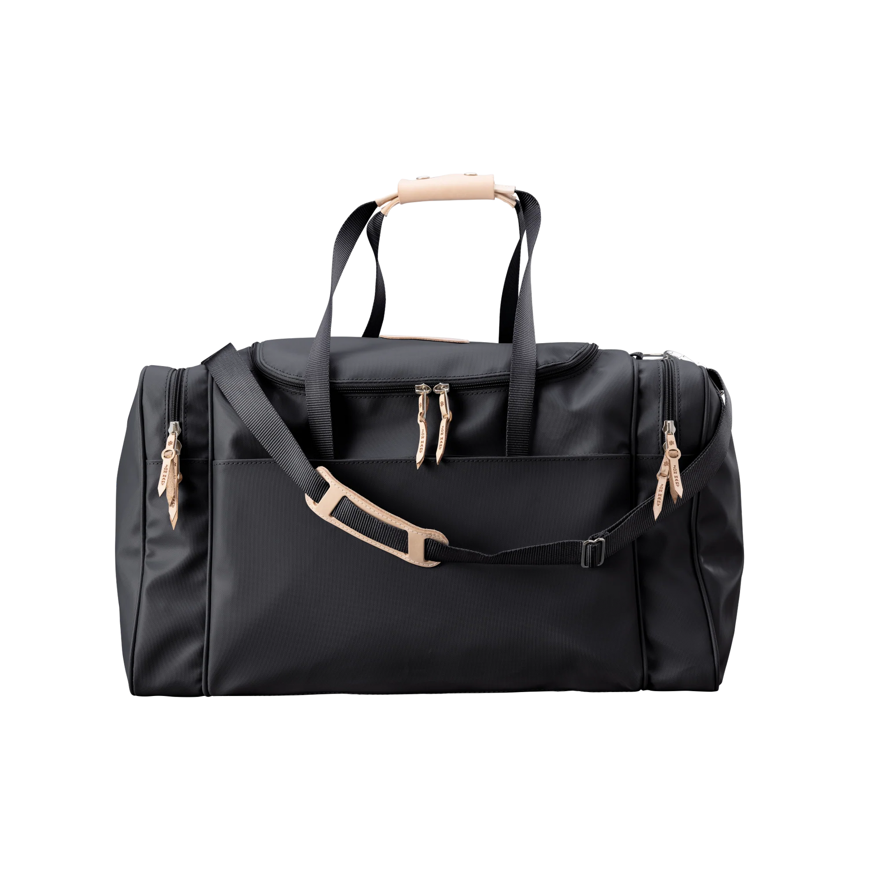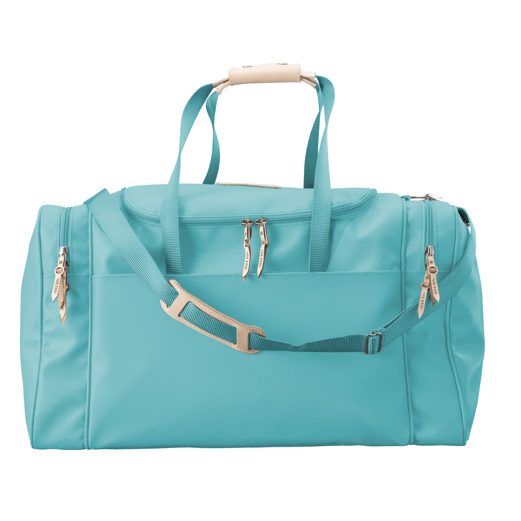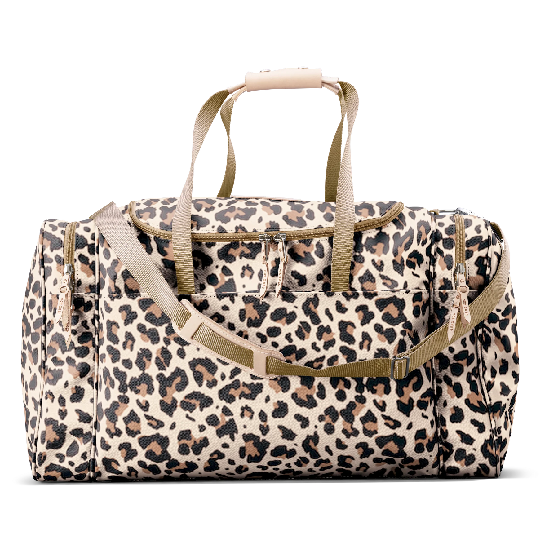 Travel in style and stay organized with the Jon Hart Large Square Duffel, the largest version of the brand’s most popular duffel bag. Designed with both function and sophistication in mind, this duffel provides ample space while keeping your essentials neatly organized. Featuring two compartments on each side and a wide U-shaped zipper top, it allows quick and easy access to everything you pack. The trolley sleeve on the back slips securely over the extended handle of rolling luggage, making it the perfect companion for smooth travel. Crafted from durable coated canvas with Natural Leather trim, it offers long-lasting use with a refined finish. Details like fully zippered closures with silver hardware, reinforced webbing handles with leather accents, and a detachable webbing shoulder strap make it as practical as it is stylish. With dimensions of 13h x 24w x 13d inches, this duffel is large enough to fit what you need without sacrificing timeless design.