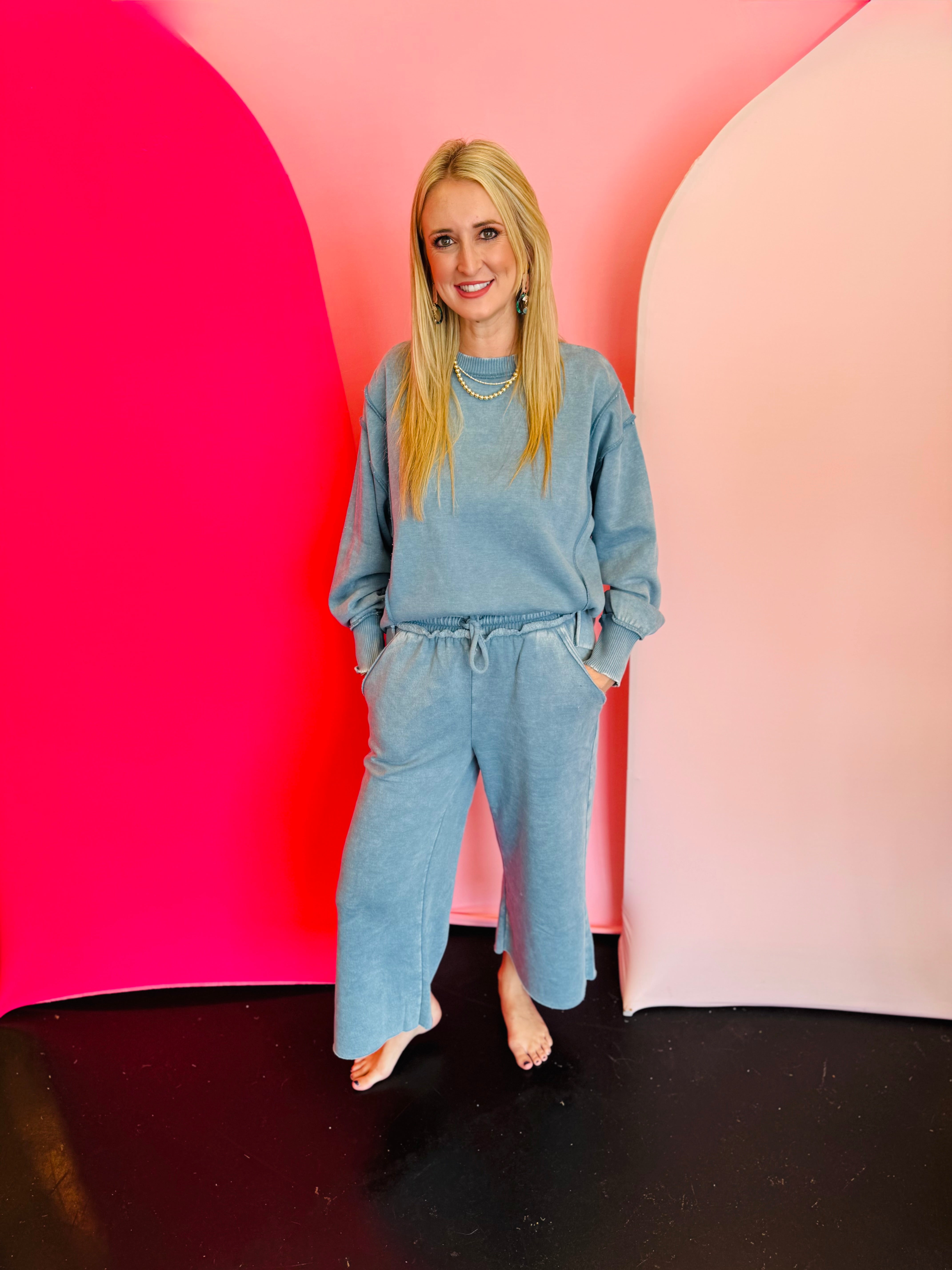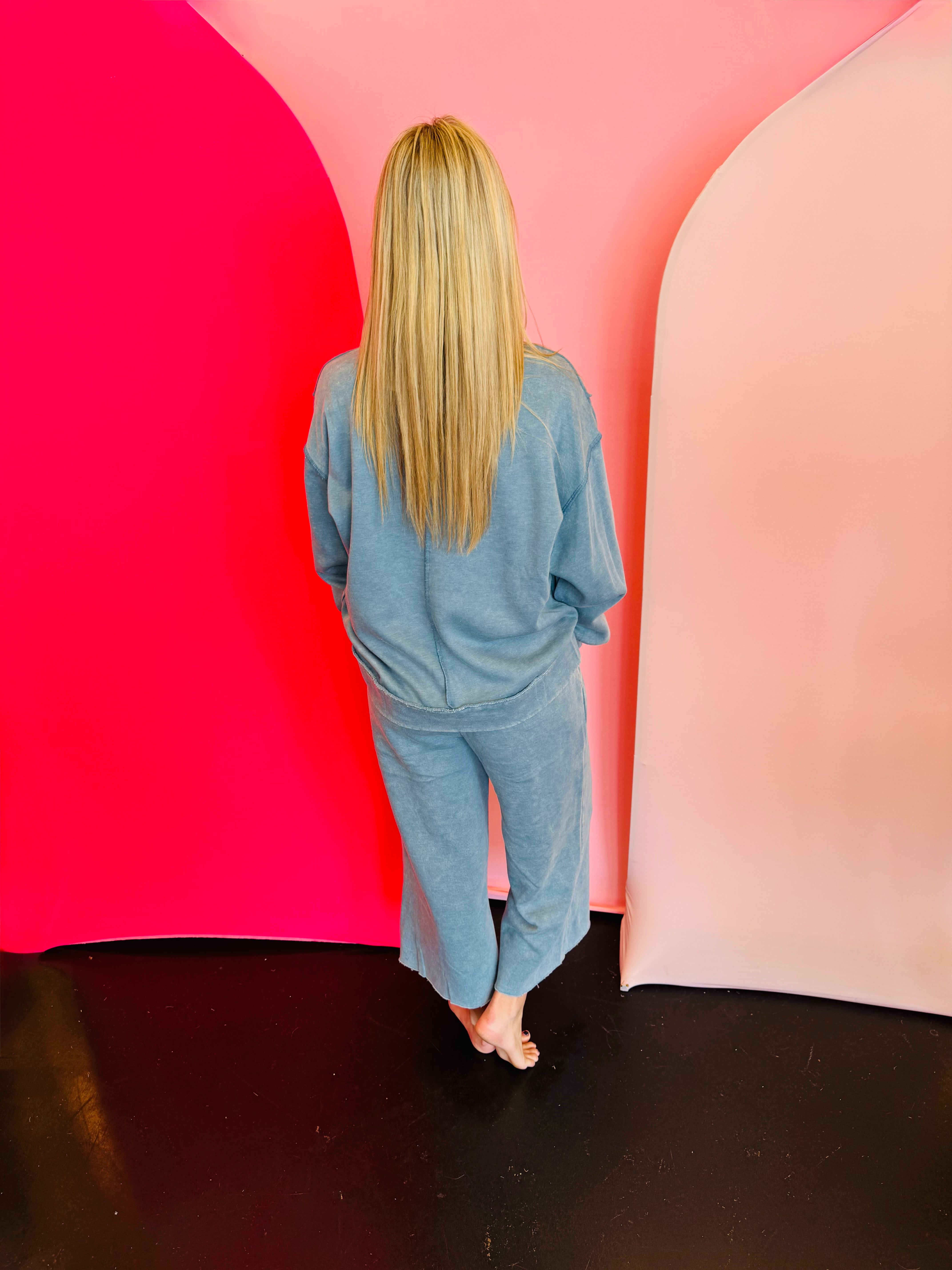 Stay cozy and effortlessly stylish with our Blue Grey Acid Wash Bottom Band Exposed-Seam Fleece Sweatshirt—a must-have for casual days, weekend errands, and on-trend loungewear looks. This sweatshirt combines comfort with an edgy, streetwear vibe. The blue grey acid wash finish creates a unique, vintage-inspired look, while exposed seam details add texture and dimension. A relaxed fit and side slits provide easy movement and a flattering drape, making it perfect to layer over leggings, biker shorts, or high-waisted jeans. With a total body length of 26.5" (front) and chest of 48" approx. (measured from Small), this sweatshirt delivers all-day comfort and a fashion-forward edge—ideal for lounging, travel, or everyday streetwear styling.