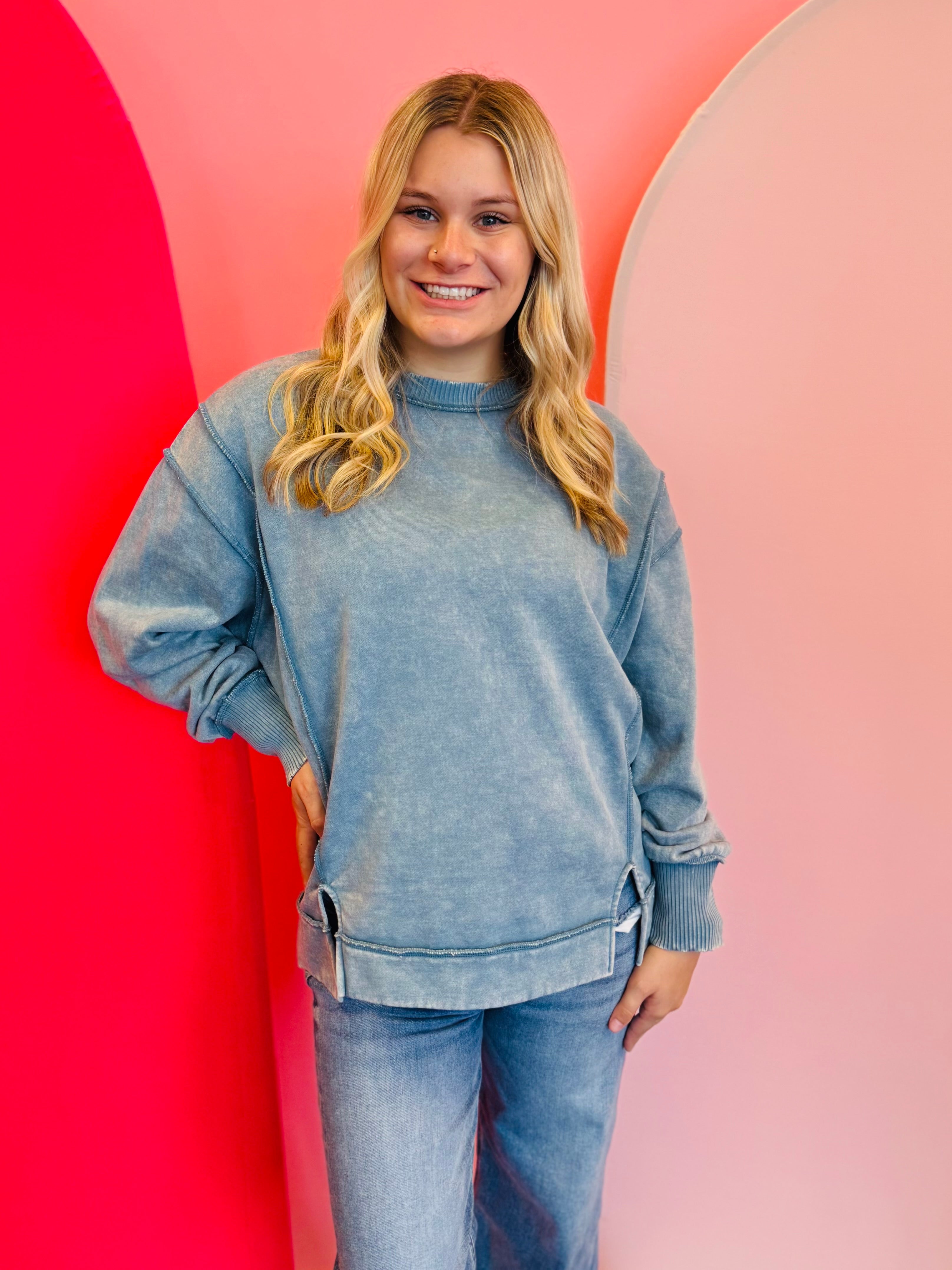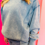 Blue grey acid wash fleece sweatshirt with exposed seams, side slits, and a bottom band.