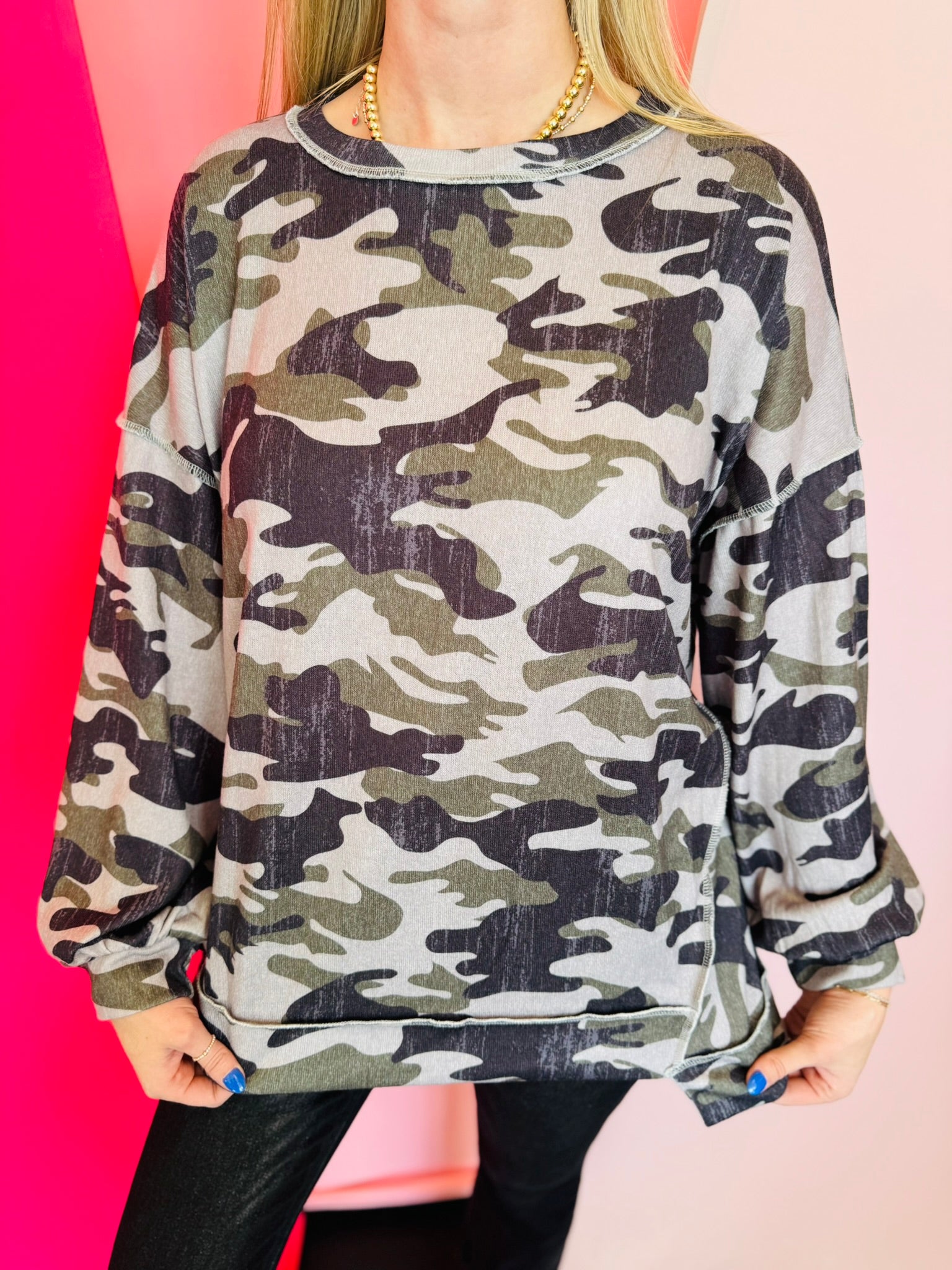 Stay effortlessly cozy and stylish with our Camo Relaxed Pullover, a versatile long sleeve top designed for everyday comfort. Crafted from a soft, stretchy blend of 95% polyester and 5% elastane, this pullover offers a loose, relaxed fit that drapes beautifully without feeling bulky. The classic neutral camouflage print features earthy greens, warm tans, and soft charcoal tones, making it easy to pair with denim, leggings, joggers, or your favorite lounge pieces. Lightweight yet cozy, it’s ideal for casual outings, weekend wear, errands, or layering during cooler seasons. Whether you prefer a laid-back look or love adding subtle edge to your wardrobe, this camo pullover brings the perfect balance of comfort, versatility, and on-trend style.