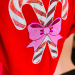 Add a touch of festive flair to your winter wardrobe with the Candy Cane Sparkle Cardigan, a cheerful and cozy holiday must-have. Crafted from 100% acrylic, this vibrant red cardigan features playful white varsity-style stripes along the neckline, cuffs, and hem for a classic yet spirited look. The button-down front offers easy layering, while the back steals the show with a dazzling sequin candy cane duo tied together with a shimmering pink bow — the perfect blend of whimsy and sparkle.