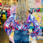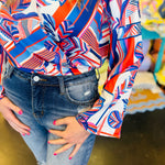 Elevate your wardrobe with our Blue Abstract Print Surplice Crop Blouse. A cream blue and coral abstract print adorns this top, while wide bell sleeves add a touch of drama. The crop waist length and front v-cross create a flattering silhouette. Make a statement in this exquisitely crafted blouse.