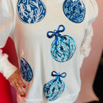 Sparkle all season long with our Blue Ornaments Sweatshirt! This elegant white top captures the festive spirit, featuring exquisite shimmering blue sequin ornament designs that truly catch the light. Each dazzling ornament is thoughtfully accented with delicate bows, adding a charming and sophisticated touch. Crafted from a comfortable and flexible blend, this sweatshirt ensures both warmth and a perfect fit. It is ideal for holiday gatherings or simply adding festive glamour to your everyday style.