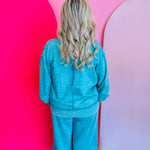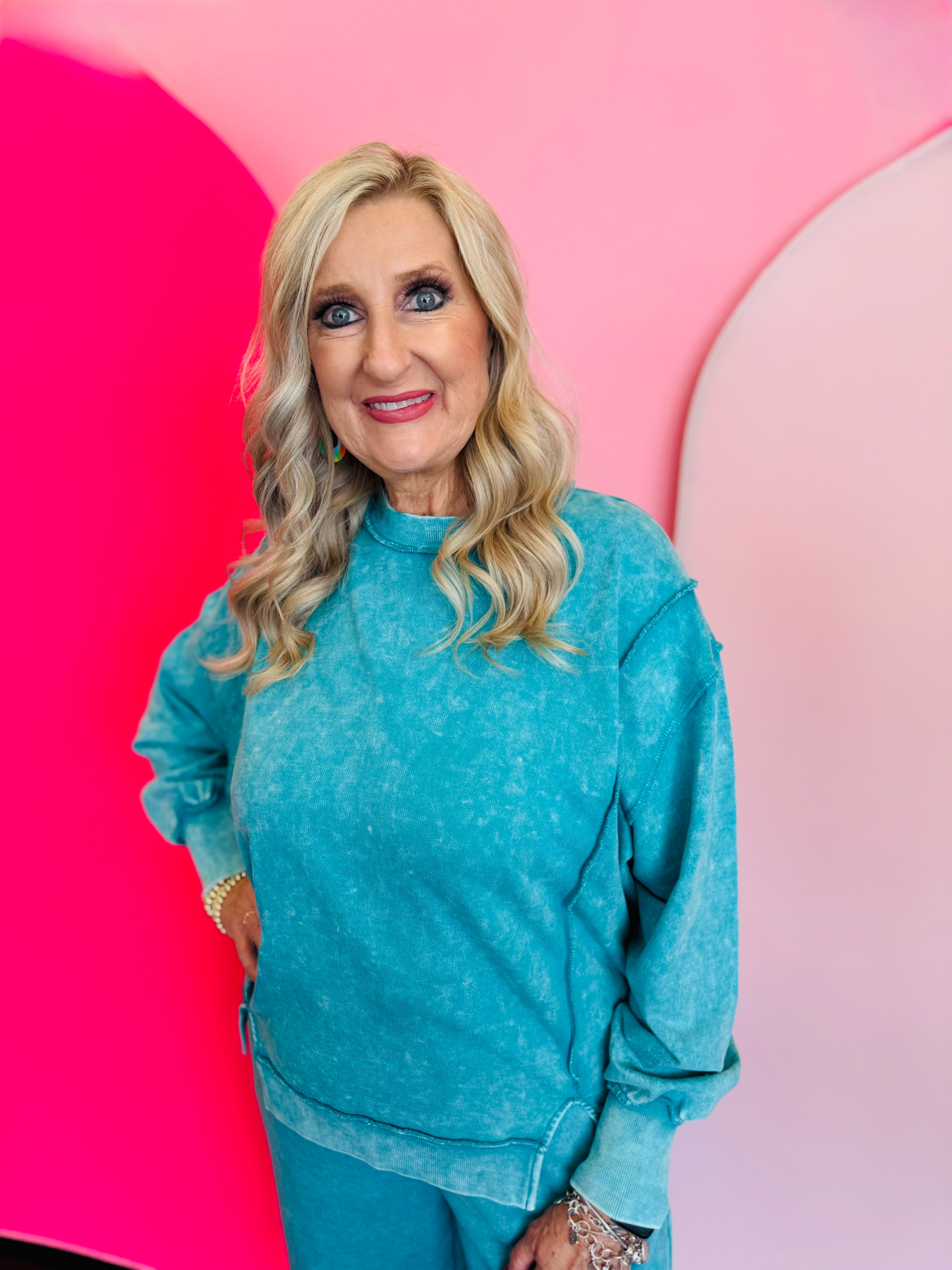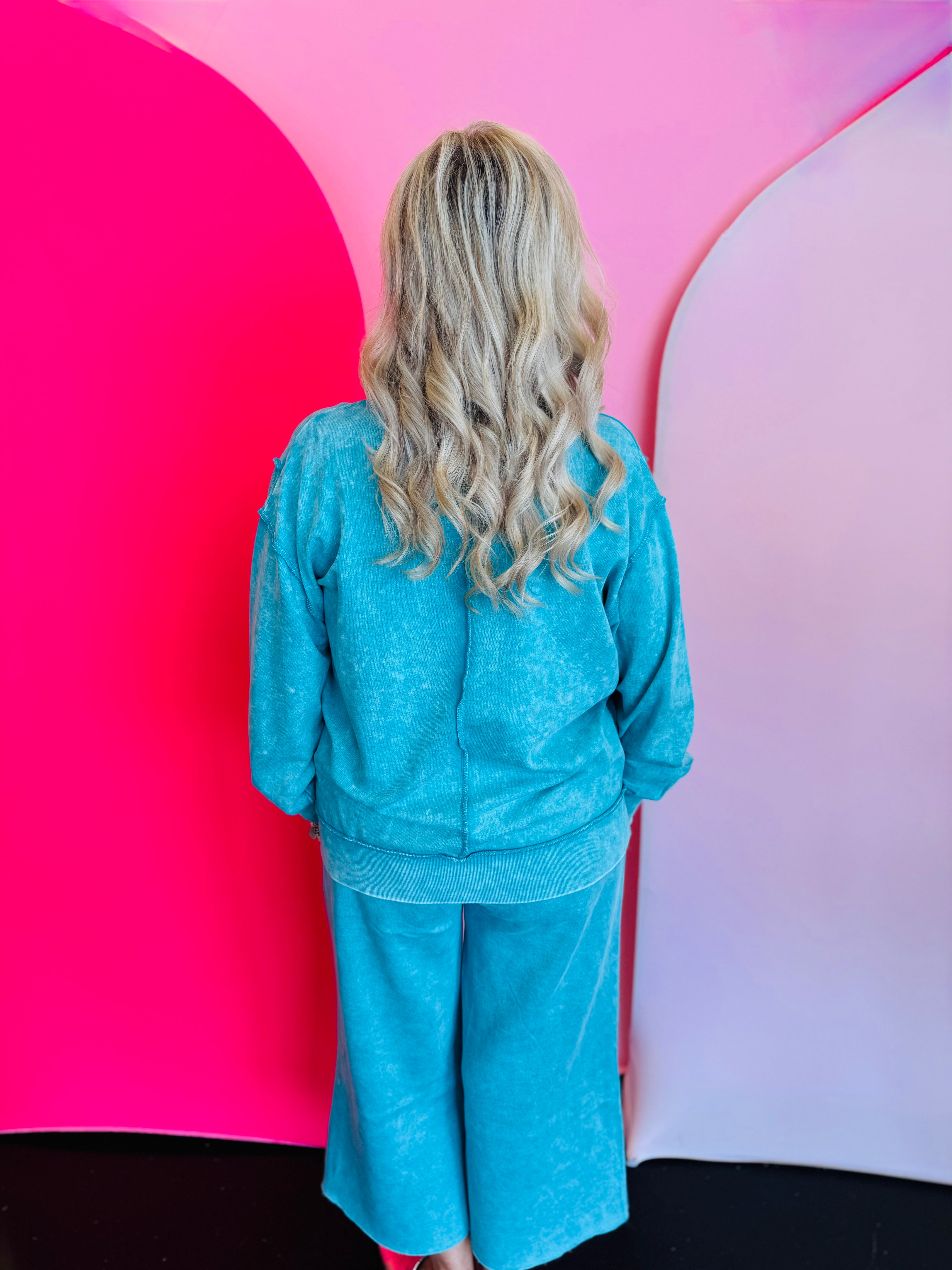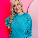 Elevate your casual wardrobe with our Lt Teal Acid Wash Fleece Sweatshirt, offering comfort with an edgy twist. Crafted entirely from soft, breathable 100% cotton French terry, this sweatshirt features a vintage-inspired acid wash paired with trendy exposed seams, creating a lived-in, effortless look. A stylish hi-low hem and a back patch detail add modern structure and texture, making this top perfect for layering over leggings or pairing with your favorite denim. The trim, made from 97% cotton and 3% spandex, ensures subtle stretch and shape retention. With an approximate body length of 26.5” (front) and chest of 48” (measured from S/M), it delivers all-day comfort and on-trend appeal.