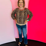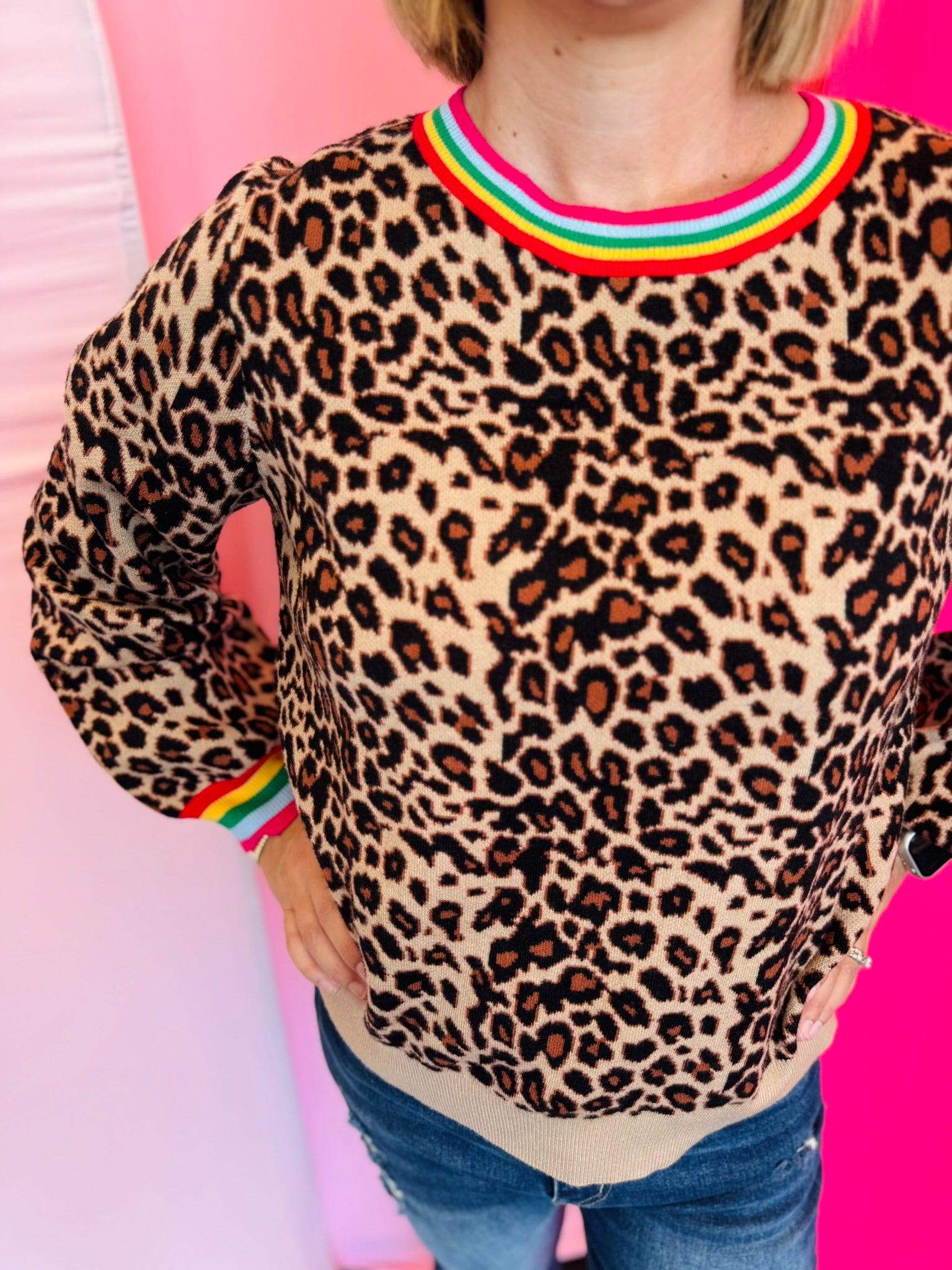 Make a bold and cozy statement with our Multi Color Binding Accent Soft Leopard Sweater. This ultra-soft piece combines playful style with all-day comfort, making it perfect for everything from casual days to coffee dates. The chic leopard print is elevated with vibrant multi-color binding along the neckline and cuffs, giving it a modern, eye-catching twist. Featuring long puff sleeves and a relaxed silhouette, it’s easy to layer over tanks or pair with your favorite denim for an effortless, standout look. Whether you’re lounging at home or stepping out, this sweater adds warmth, personality, and charm to any outfit.