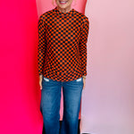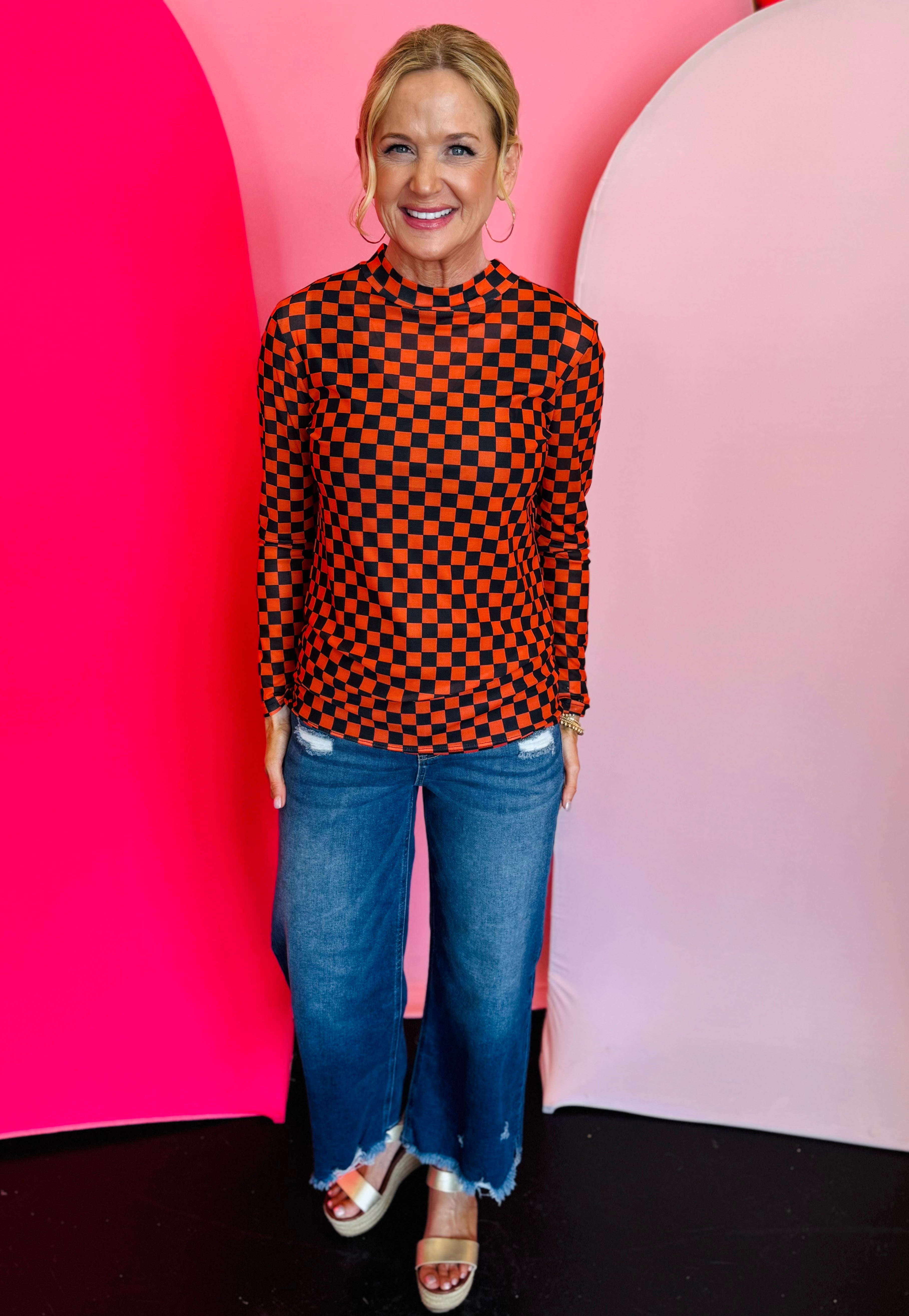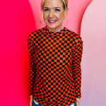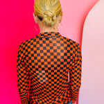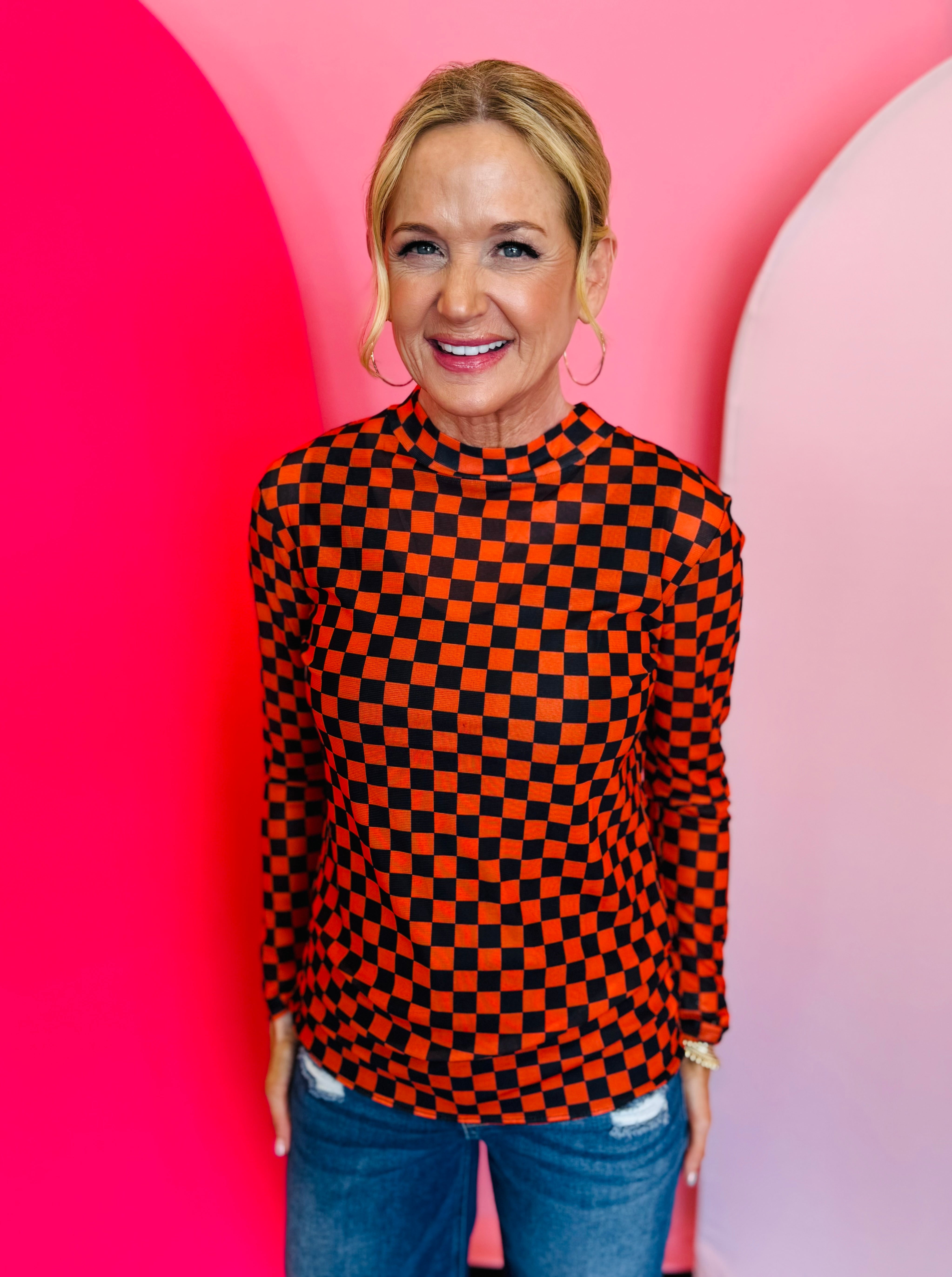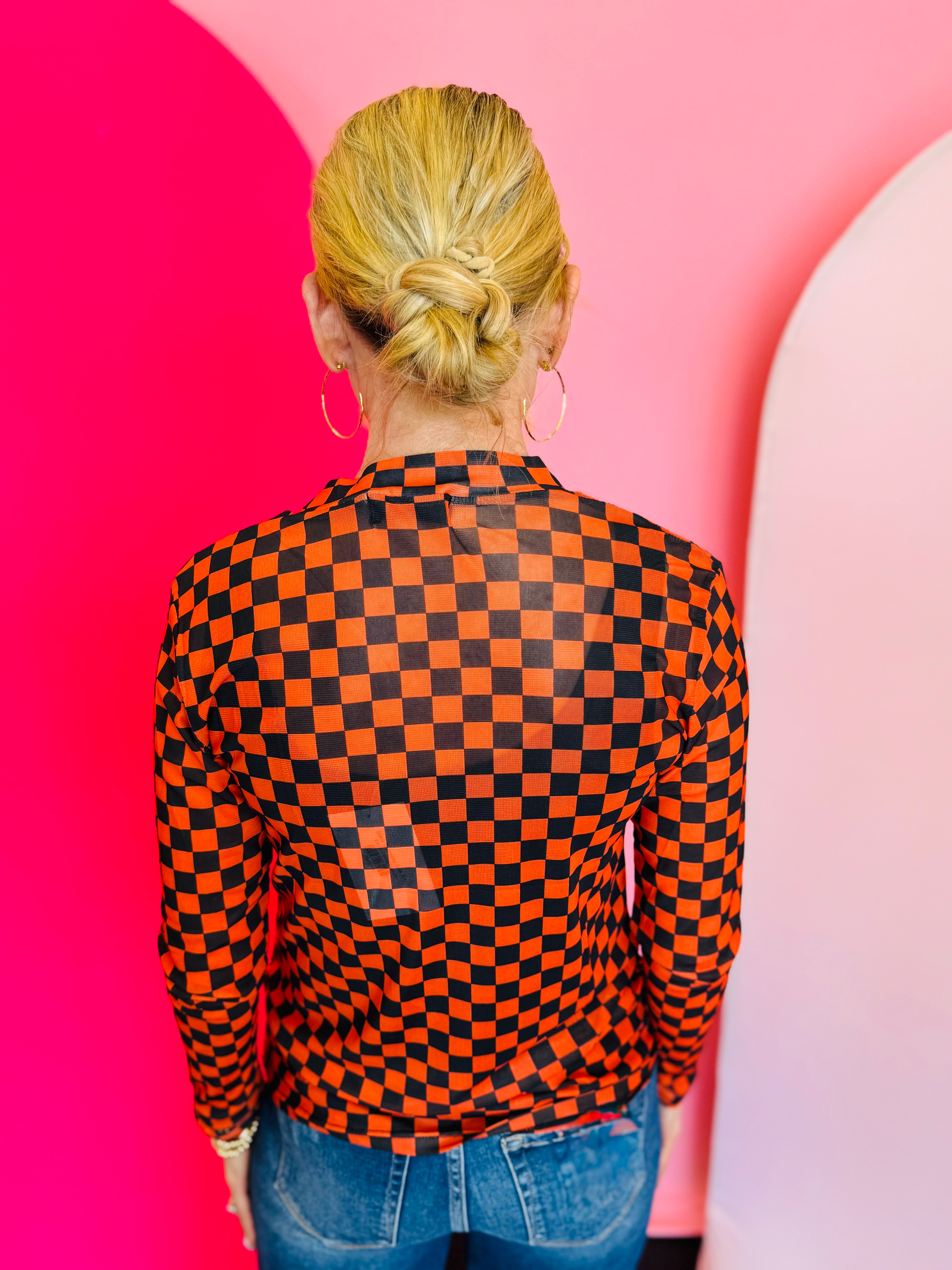 Unleash your inner cheerleader with this Pep Rally Mesh Top in vibrant orange and black! The bold checkerboard pattern will have you standing out in any crowd, while the mesh fabric keeps you cool and comfortable. Perfect for game day or any casual outing. Go team!